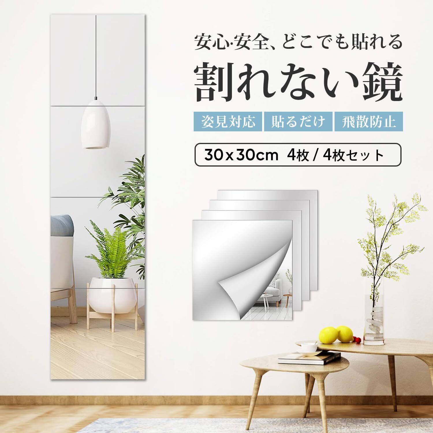姿見 全身 鏡 どこでも貼れる割れない鏡 壁掛け ミラー 貼る鏡 アクリルミラー 飛散防止 穴あけ不要 便利 軽量 浴室 玄関 壁 リビング クローゼット (30×30cm 4枚セット)