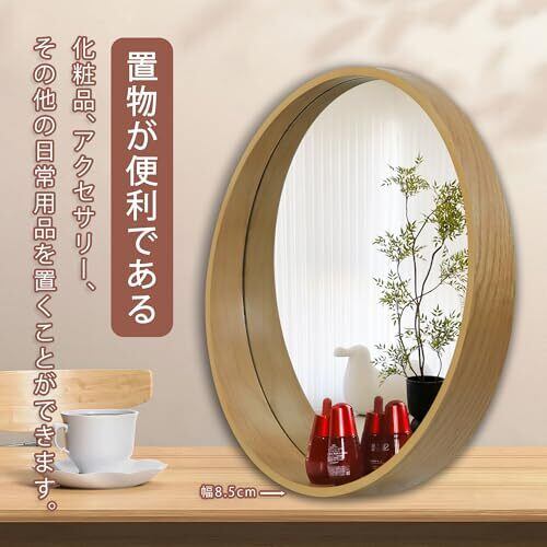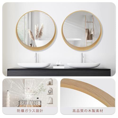 Browgrow 壁掛けミラー 木製 鏡 壁掛け鏡 丸型ミラー ウォールミラー 天然木フレーム 丸鏡 円形ミラー 飛散防止 洗面 玄関 化粧 (ナチュラル, 直径50cm)