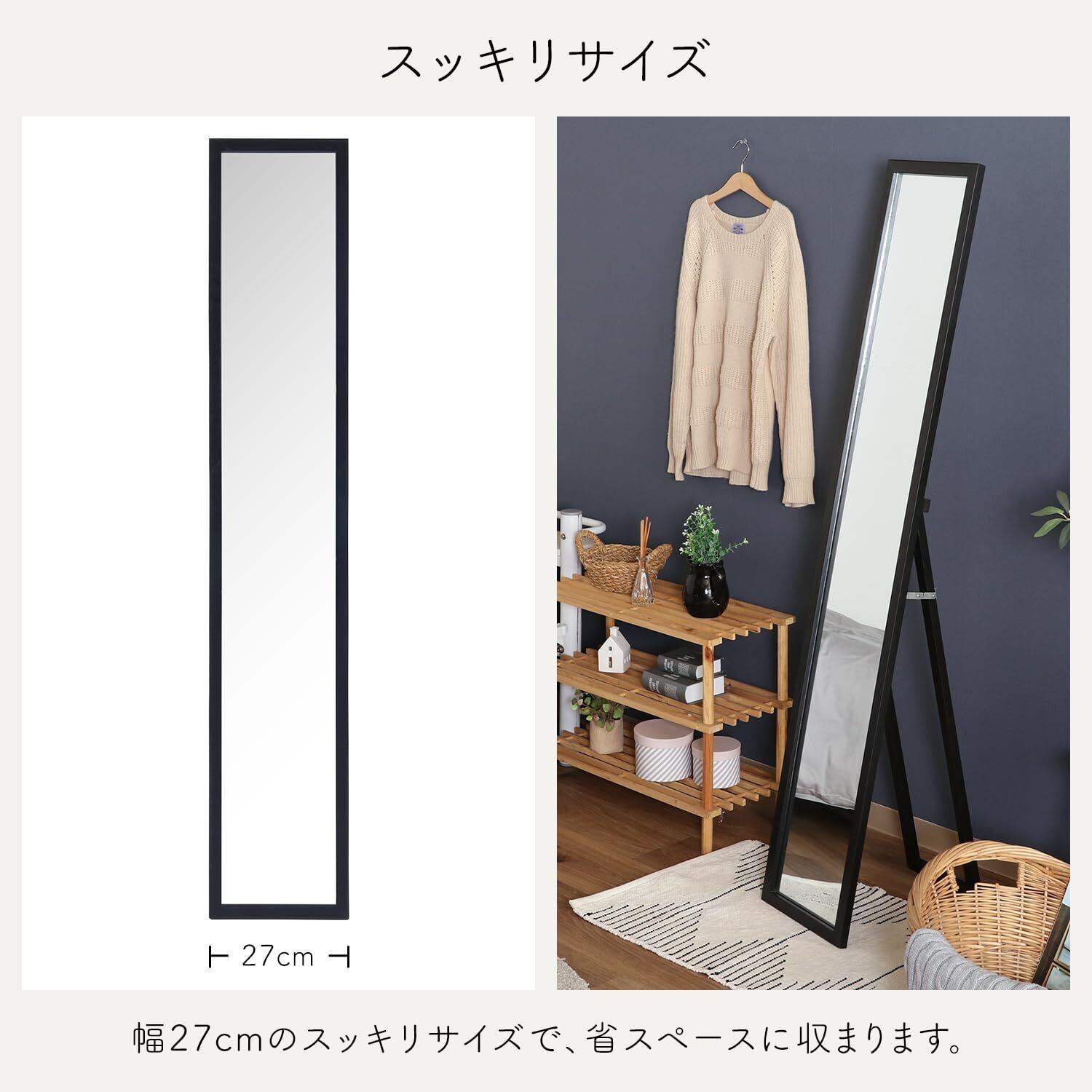このスタンドミラーは、ブラックの木製フレームが魅力的な姿見です。シンプルで洗練されたデザインは、どんなインテリアにもマッチし、部屋をおしゃれに演出します。幅27cmのコンパクトなサイズ感は、一人暮らしや限られたスペースでも活躍します。