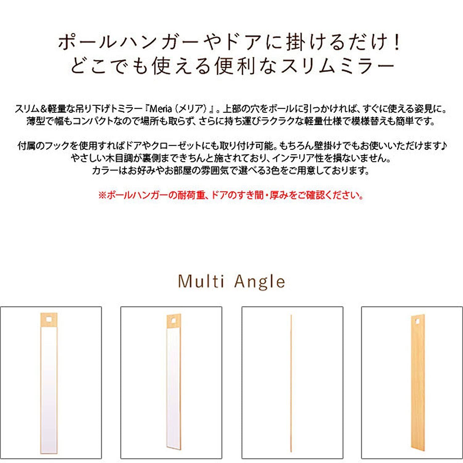 スリム&軽量な吊り下げスリムミラー『Meria(メリア)』。 上部の穴をポールに引っかければ、すぐに使える姿見に。 薄型で幅もコンパクトなので場所も取らず、さらに持ち運びラクラクな軽量仕様で模様替えも簡単です。付属のフックを使用すればドアやクローゼットにも取り付け可能。もちろん壁掛けでもお使いいただけます。やさしい木目調が裏側まできちんと施されており、インテリア性を損ないません。カラーはお好みやお部屋の雰囲気で選べる3色をご用意しております。※ポールハンガーの耐荷重、ドアのすき間・厚みをご確認ください。(ss)