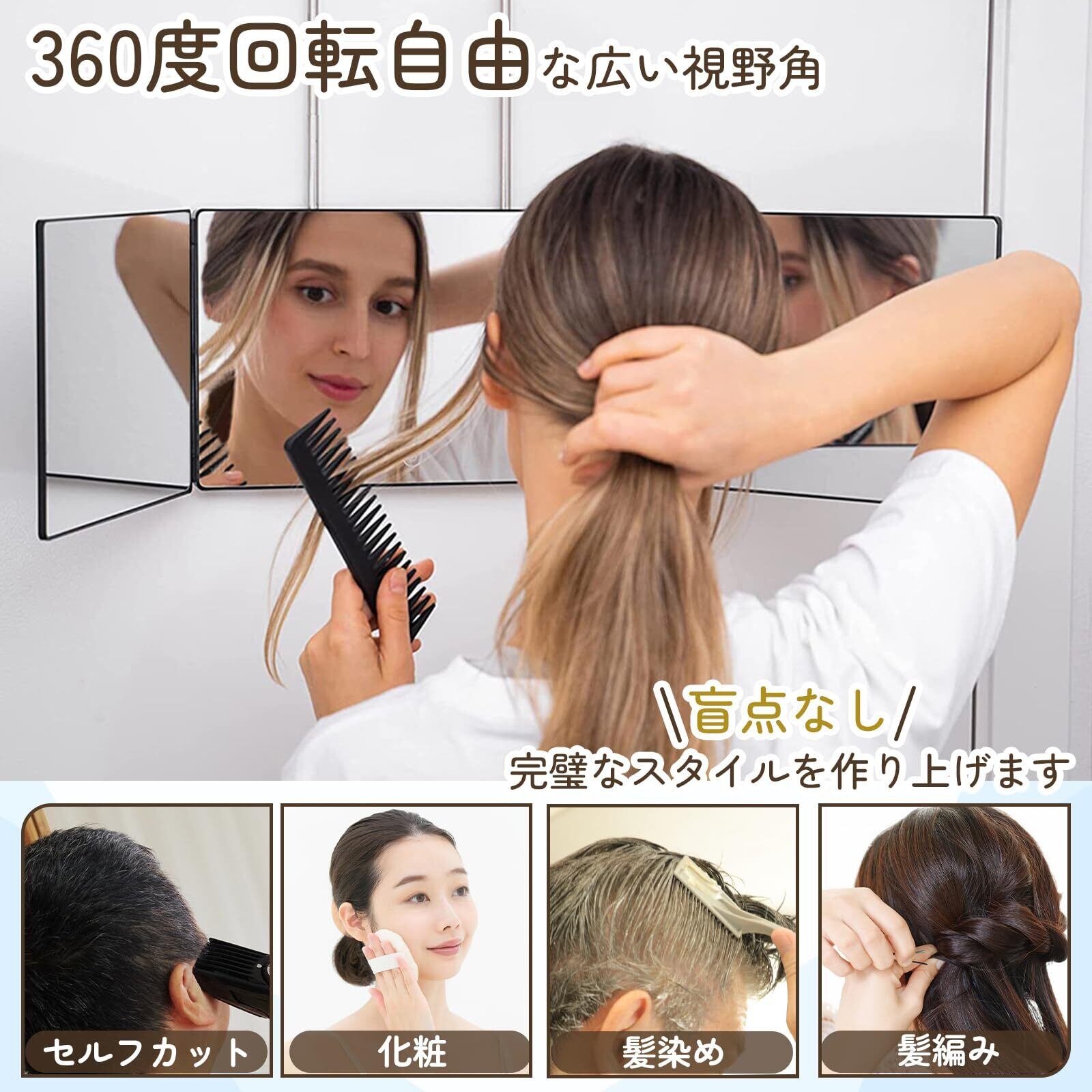 【完璧なメイク】最新セット内容: 三面鏡 x1.5倍の拡大鏡x1 360度回転設計の三面鏡、あらゆる角度から頭と顔などを快適に見ることができ、完璧なメイクを作り上げます、ヘアカット、化粧、髪染め、さげ編み、毛先切りなど、様々な用途があります。卓上での使用もでき、座り状態でメイクやヘアセットを行う場合にも使える万能型です。