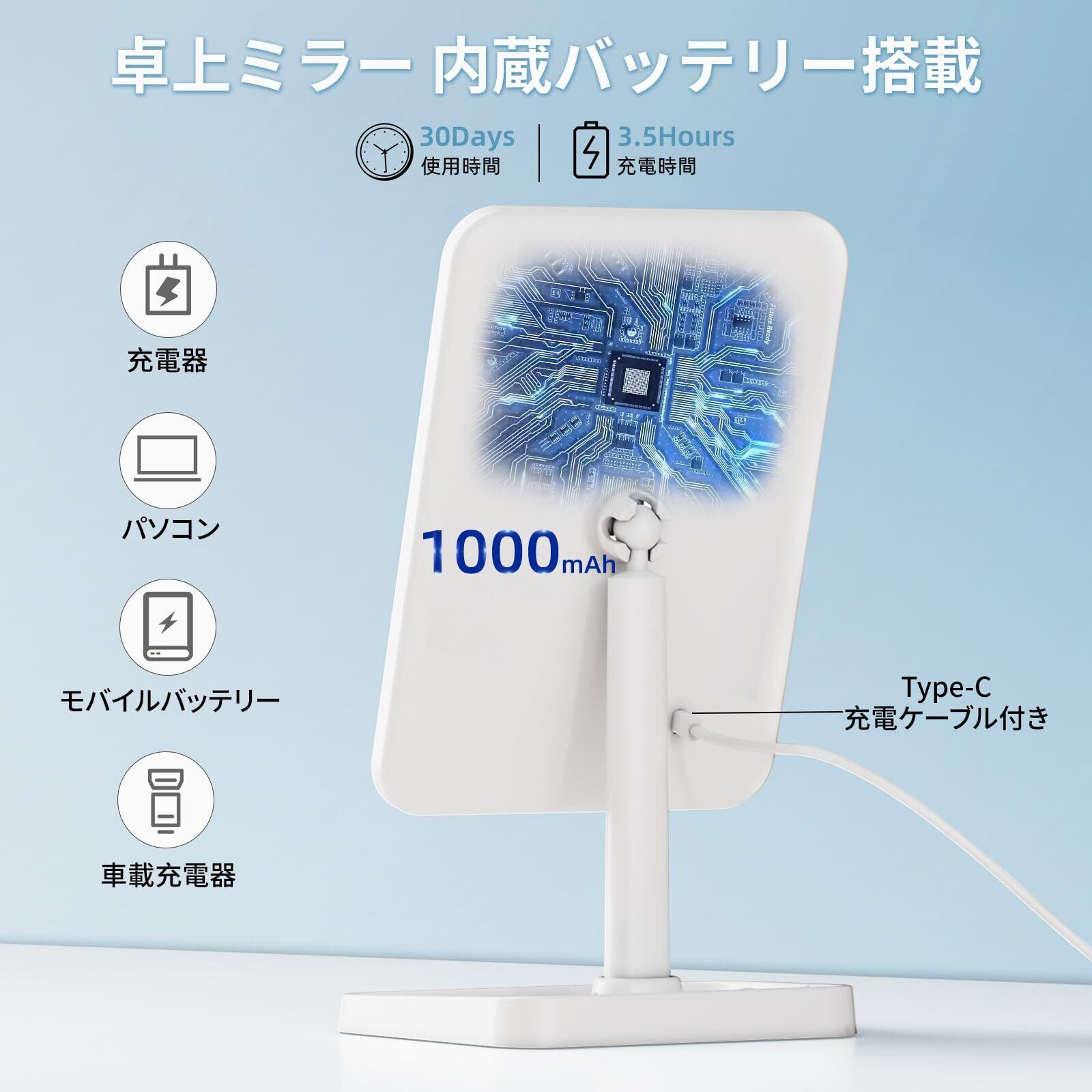 1000mAhの内蔵バッテリーを搭載した充電式ミラーなので、コンセントがない場所でも自由に使用できます。自宅はもちろん、旅行や出張先にも手軽に携帯でき、美容を追求するあなたにぴったりです。