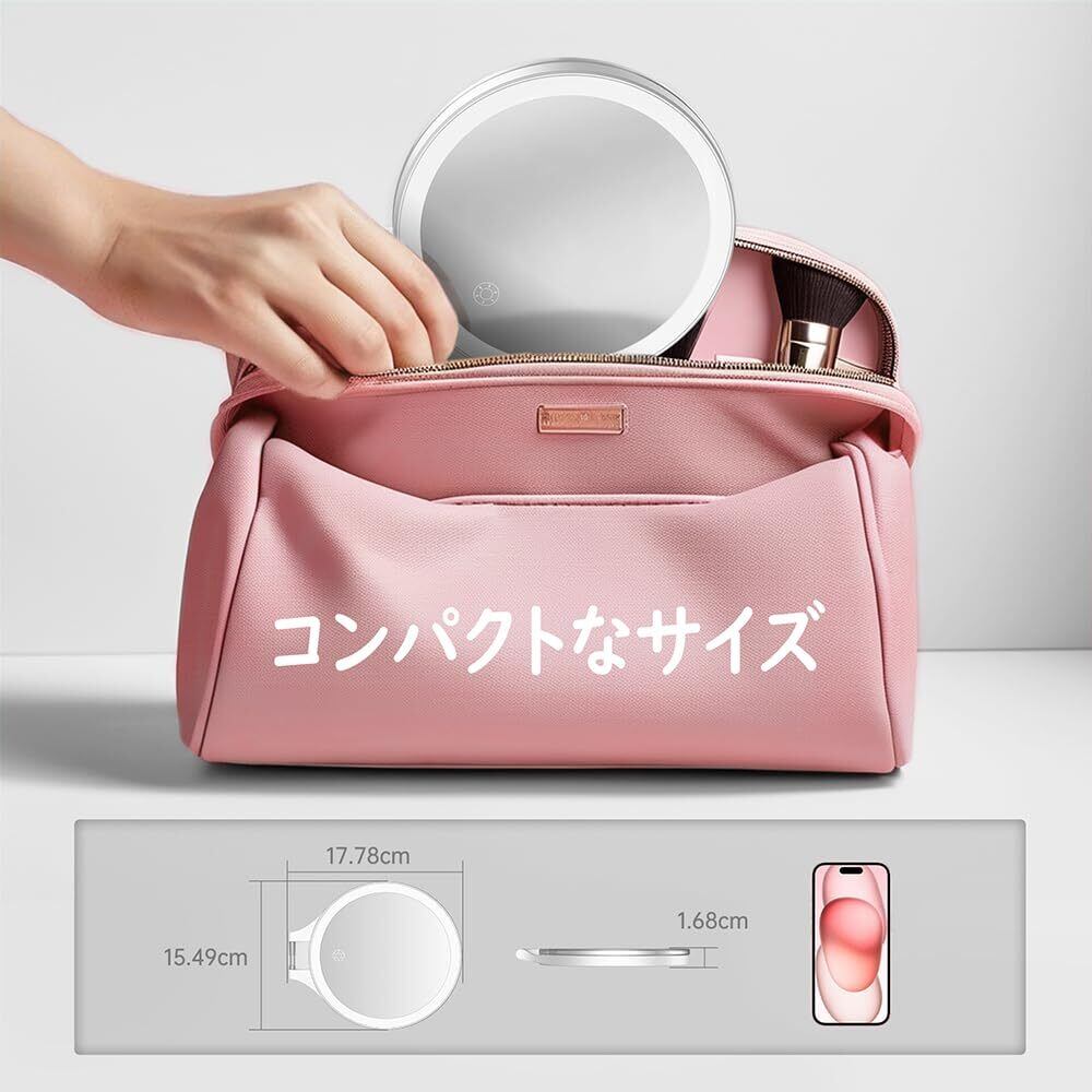 「3種類の色温度・無段階輝度調節」 昼白色・温白色・昼光色の3色に切り替えられるLEDライト付き鏡が内蔵され、ボタンを短くタップすれば色温度の切り替えができます。更に輝度の無段階調節ができ、ボタンを長くタップすればお好きな輝度まで調節可能です。様々な使用シーンを再現して、より完璧なメイクの仕上げに導きます。