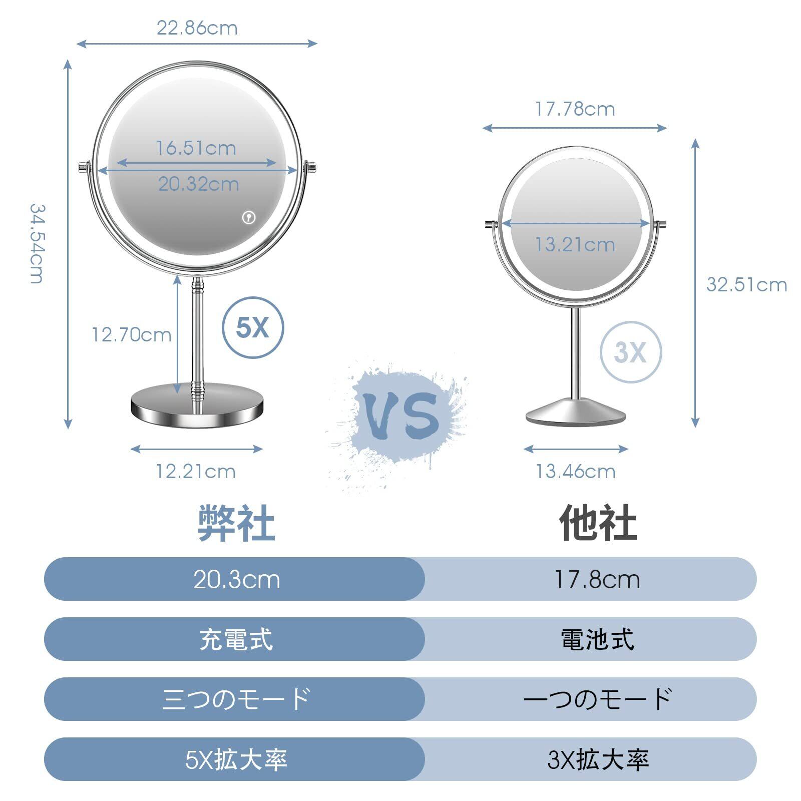 【タッチ式&3色調節】ワンタッチで「寒色・自然色・暖色」を選択可能。ライト付き機能と組み合わせれば、オフィス(寒色)からパーティー(暖色)まで、五倍拡大鏡付きで全てのシーンに対応。長押しで明るさ調節も自由自在!