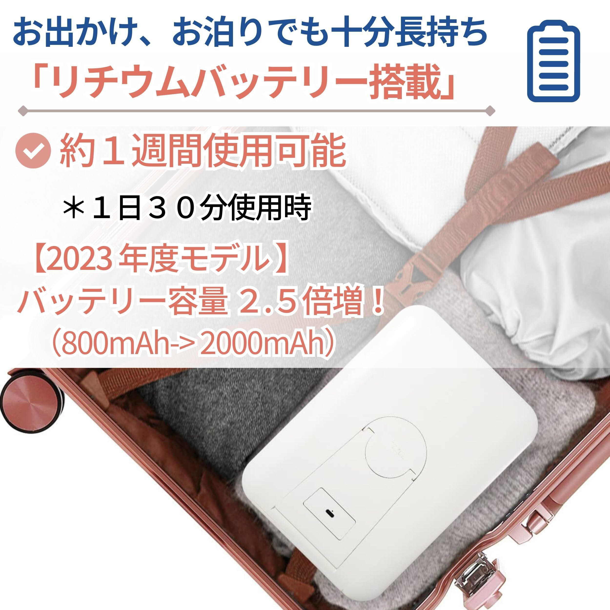 【2000mAh バッテリー付き】長期の旅行・お出かけでもご利用頂けるよう大容量リチウムバッテリー(2000mAh)を搭載しました(従来比:1.6倍)。通常利用(1日30分)で1週間以上ご利用頂けます。