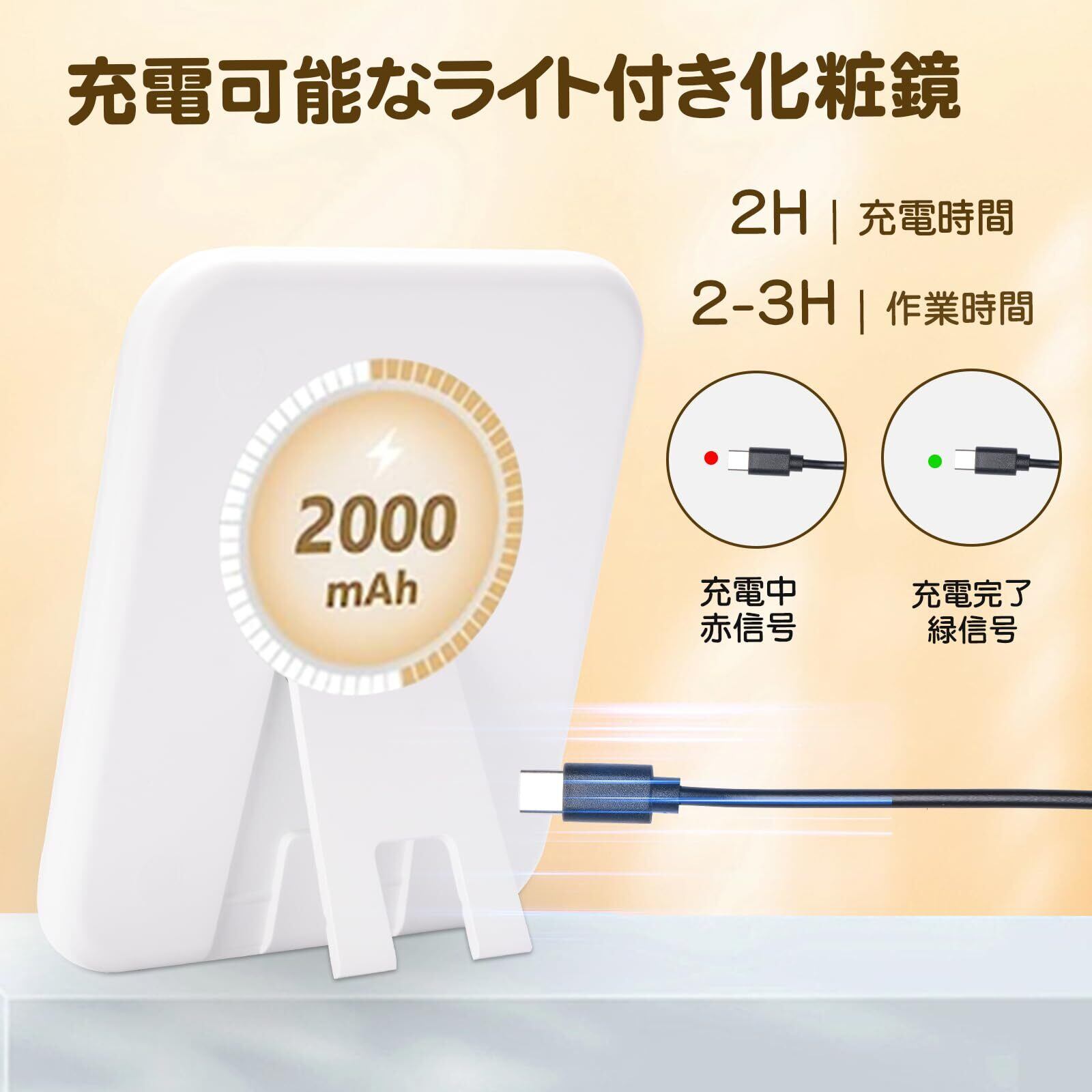 【充電式のライト付きミラー】化粧鏡には2000 mAh充電可能なリチウム電池が内蔵されています。約7日間の長持ちで週1回の充電でOKです。いつでもどこでも理想的なメイク環境を提供し、外出時の化粧鏡の悩みを解消します。充電中は赤、完了は緑ランプで状態が一目瞭然です。