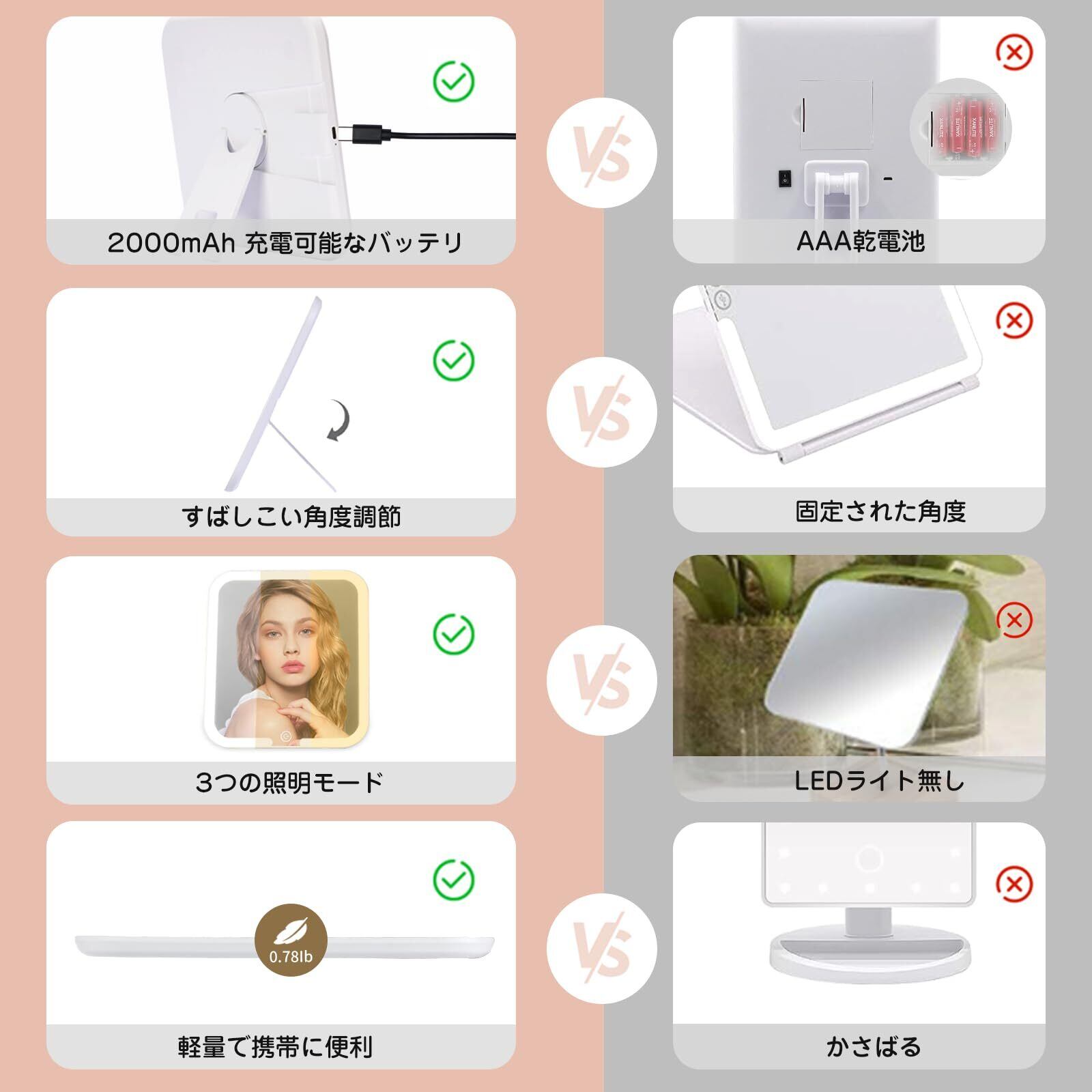 鏡 卓上 ライト付きミラー メイク 3つ光色 明るさ無段階調光 360°回転可能ブランケット 角度は自由に調整 卓上鏡 女優ミラー USB充電式 消し忘れ防止機能 収納便利 旅行用 持ち運びに便利 卓上ミラー 化粧鏡 折りたたみ