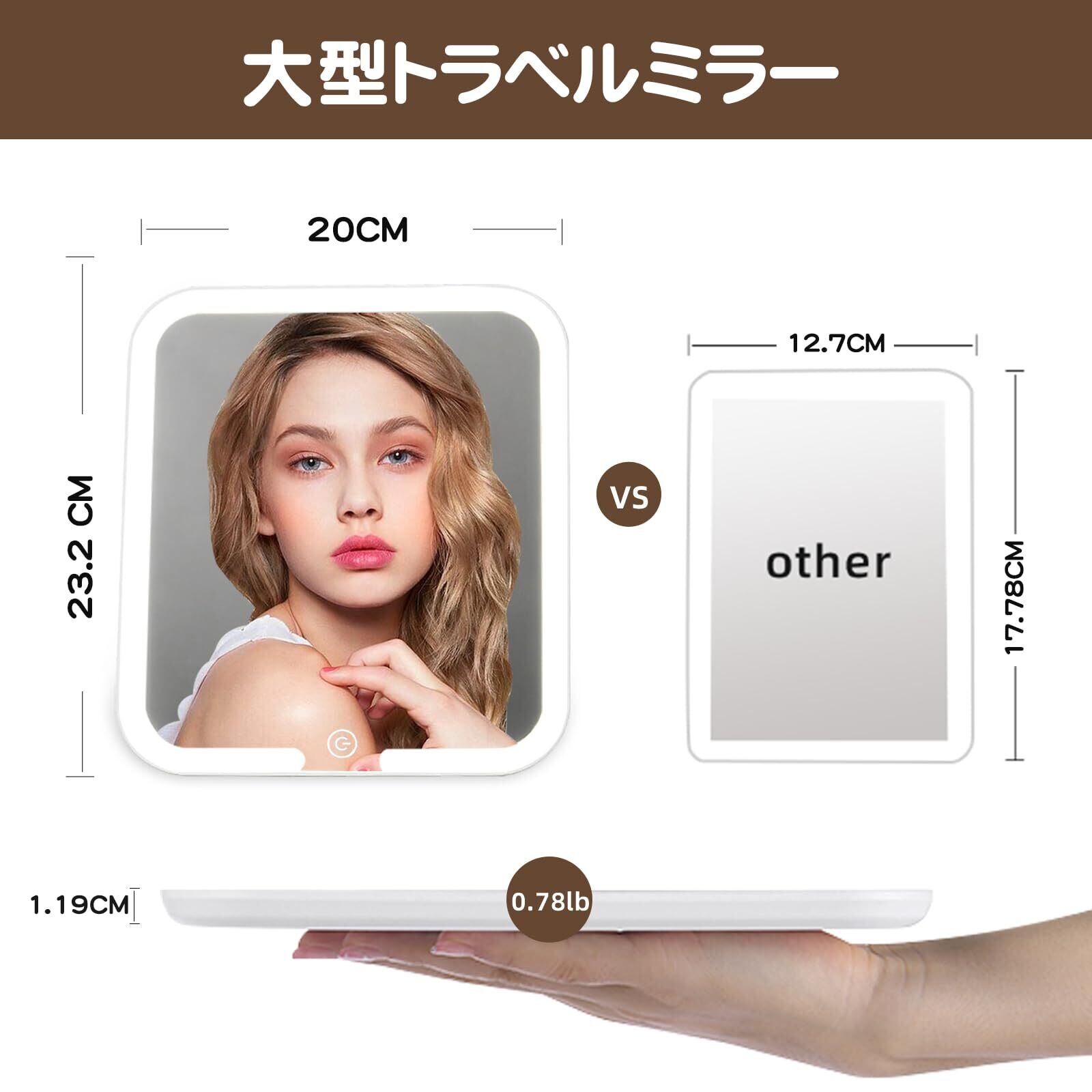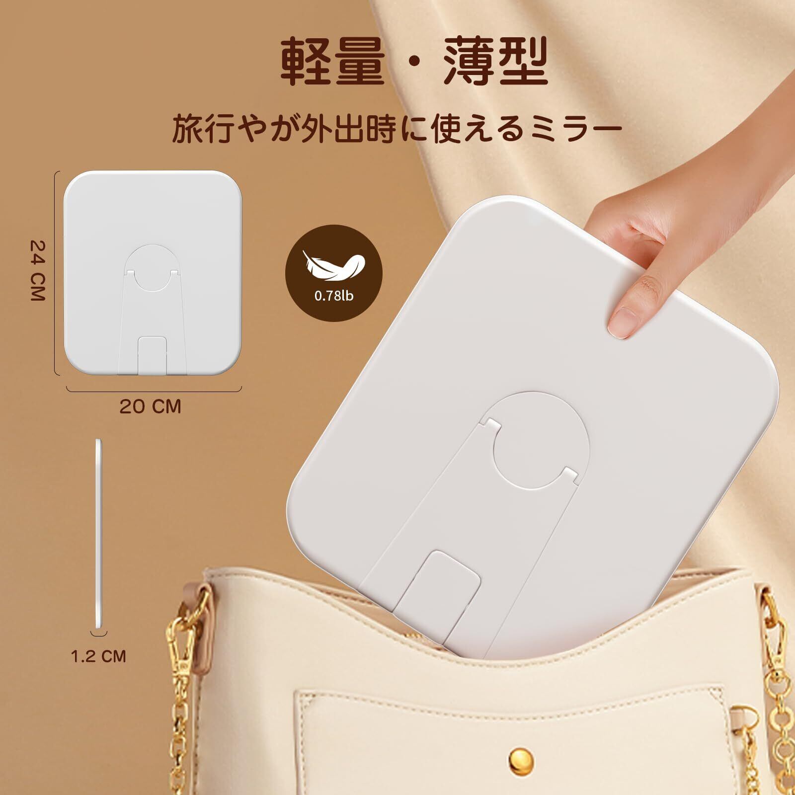 【多用途の女優ミラー】23CM×20CMの大型鏡面が顔全体をしっかり映す化粧鏡です。薄型でカバンに収納しやすく、旅行や外出時でもプロのようなメイク環境を実現します。卓上 鏡としてても、移動中のライト付きミラーとしても使えます。