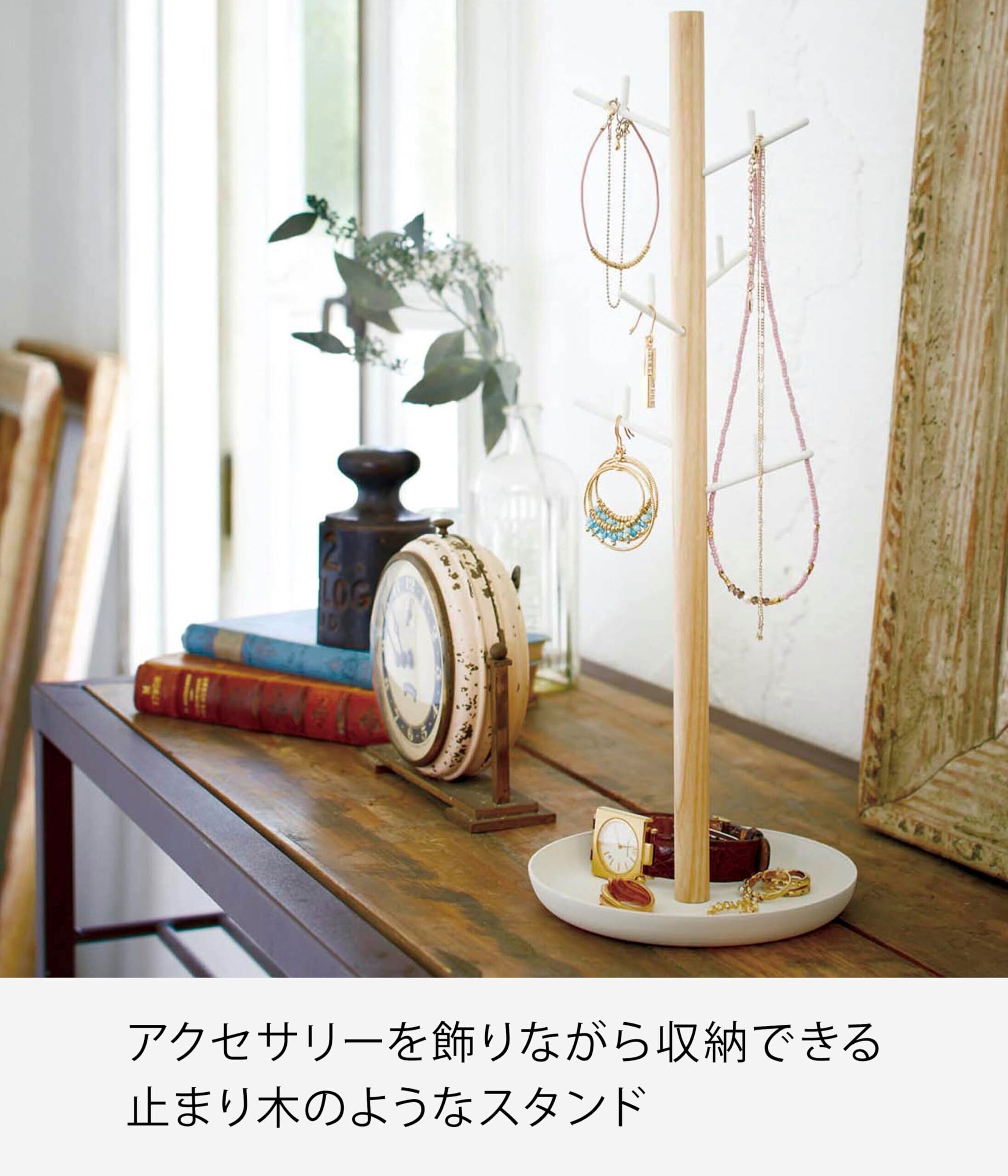 山崎実業のアクセサリーハンガーは、モダンでシンプルなデザインが特徴です。ホワイトの色合いはどんなインテリアにも馴染み、スッキリとした印象を与えます。約W13×D13×H35.5cmのコンパクトなサイズ感は、ドレッサーやクローゼットにぴったりです。