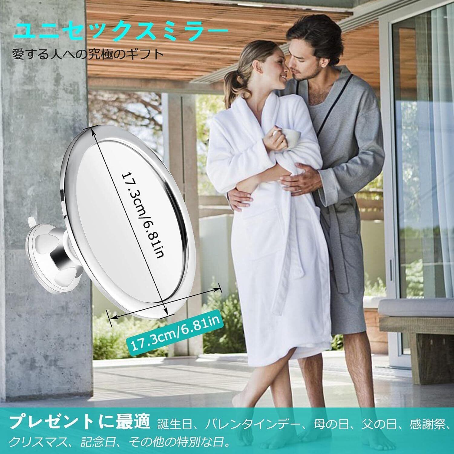 - 特徴:360°回転、リアルフォグフリーミラー、吸盤付き、ホルダー付き、防錆