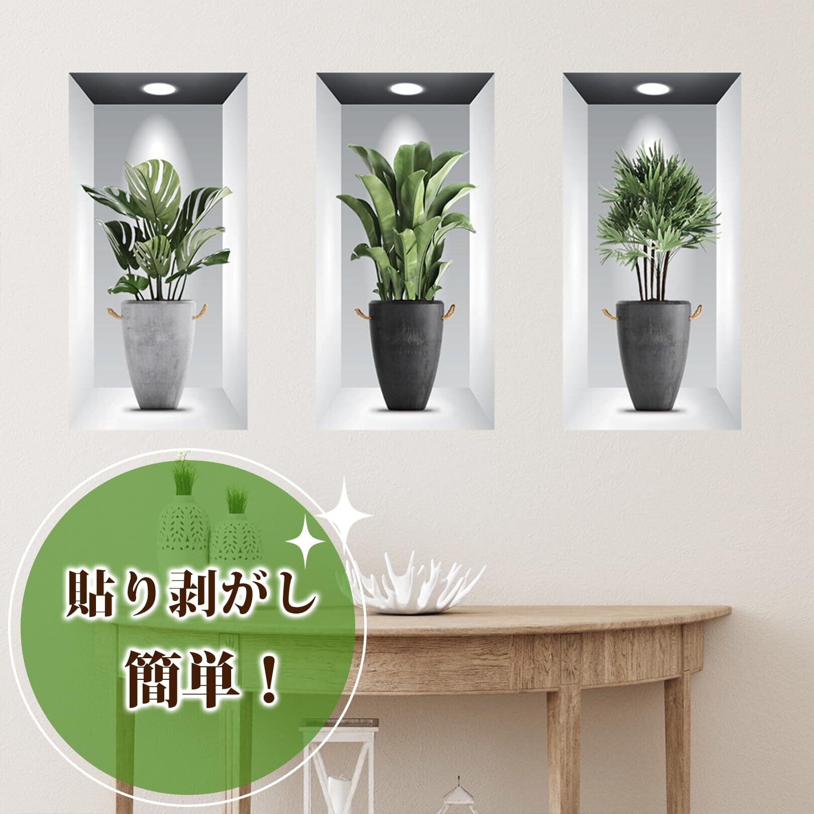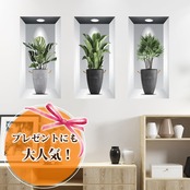 ウォールステッカーは、人気の観葉植物の3Dステッカー3枚セット。奥行きのある飾り棚に置かれたリアルなグリーンは奥行きを感じられお部屋を広く見せる視覚効果も期待できます。お部屋を楽しくおしゃれに模様替え。