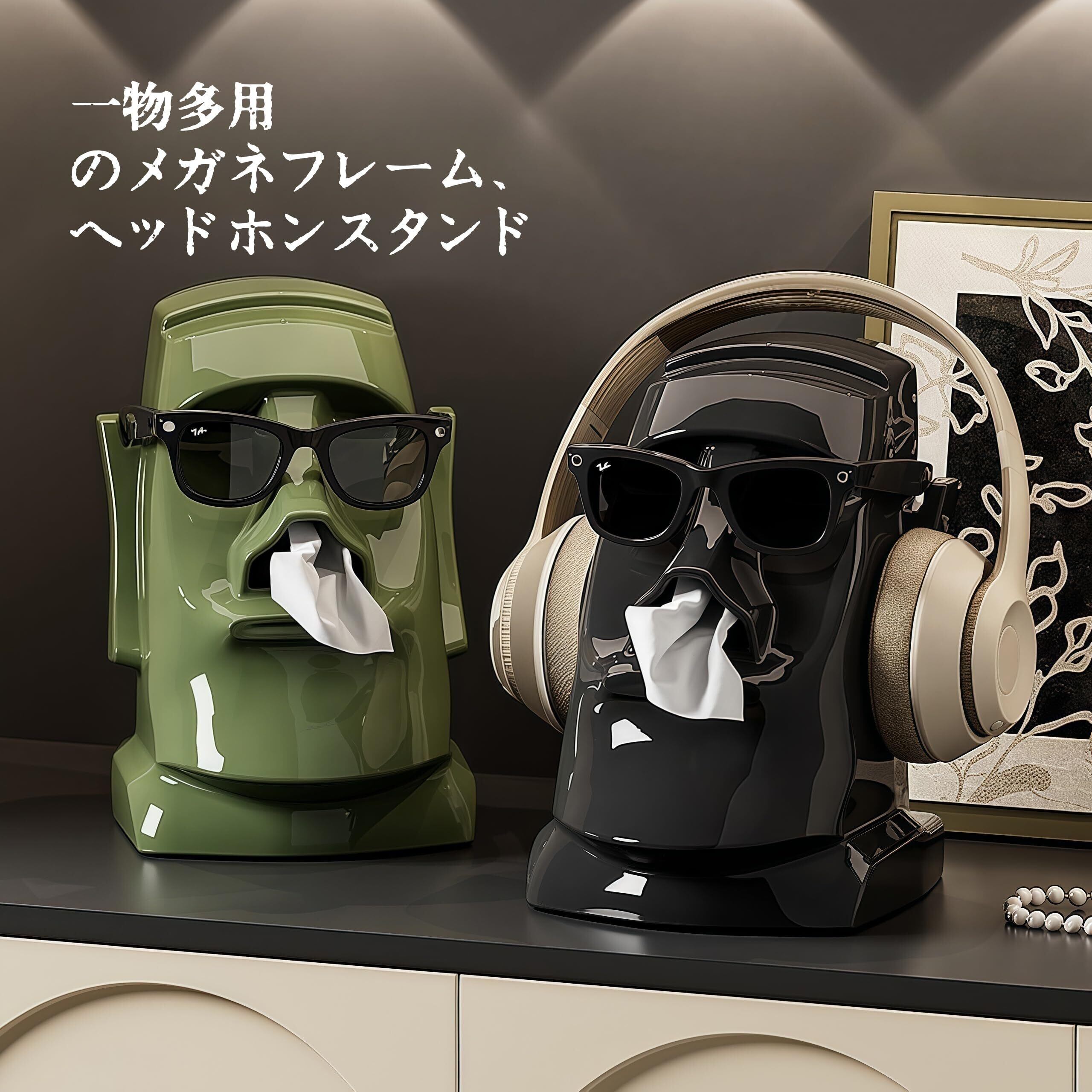 3 機能一体型の多機能デザイン:ティッシュボックス、ヘッドホンスタンド、眼鏡入れを 1 つのエレガントなユニットに組み合わせており、机、ベッドルーム、自宅のオフィスを整理整頓するのに最適で、スペースを節約できます。復活節島の石像をモチーフにしたデザインは芸術的な魅力を加えており、機能的なアクセサリーであると同時に装飾品でもあります。
