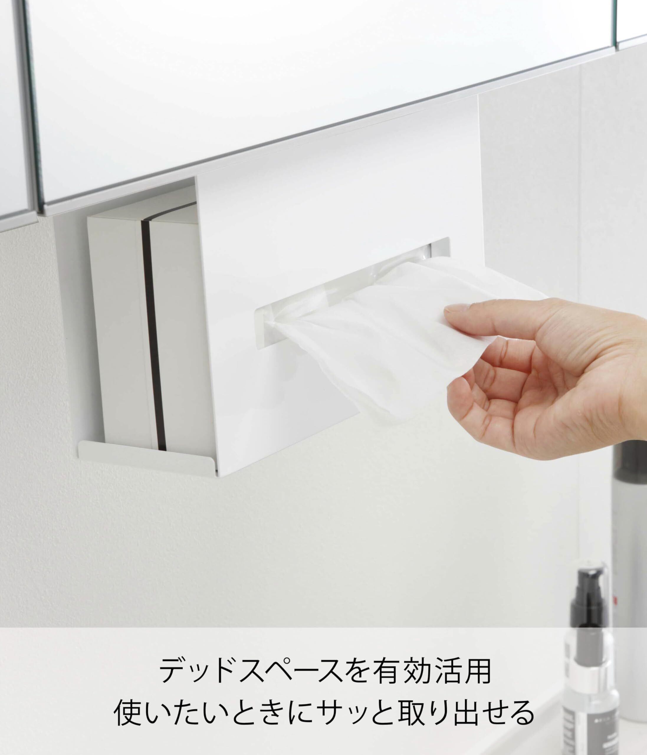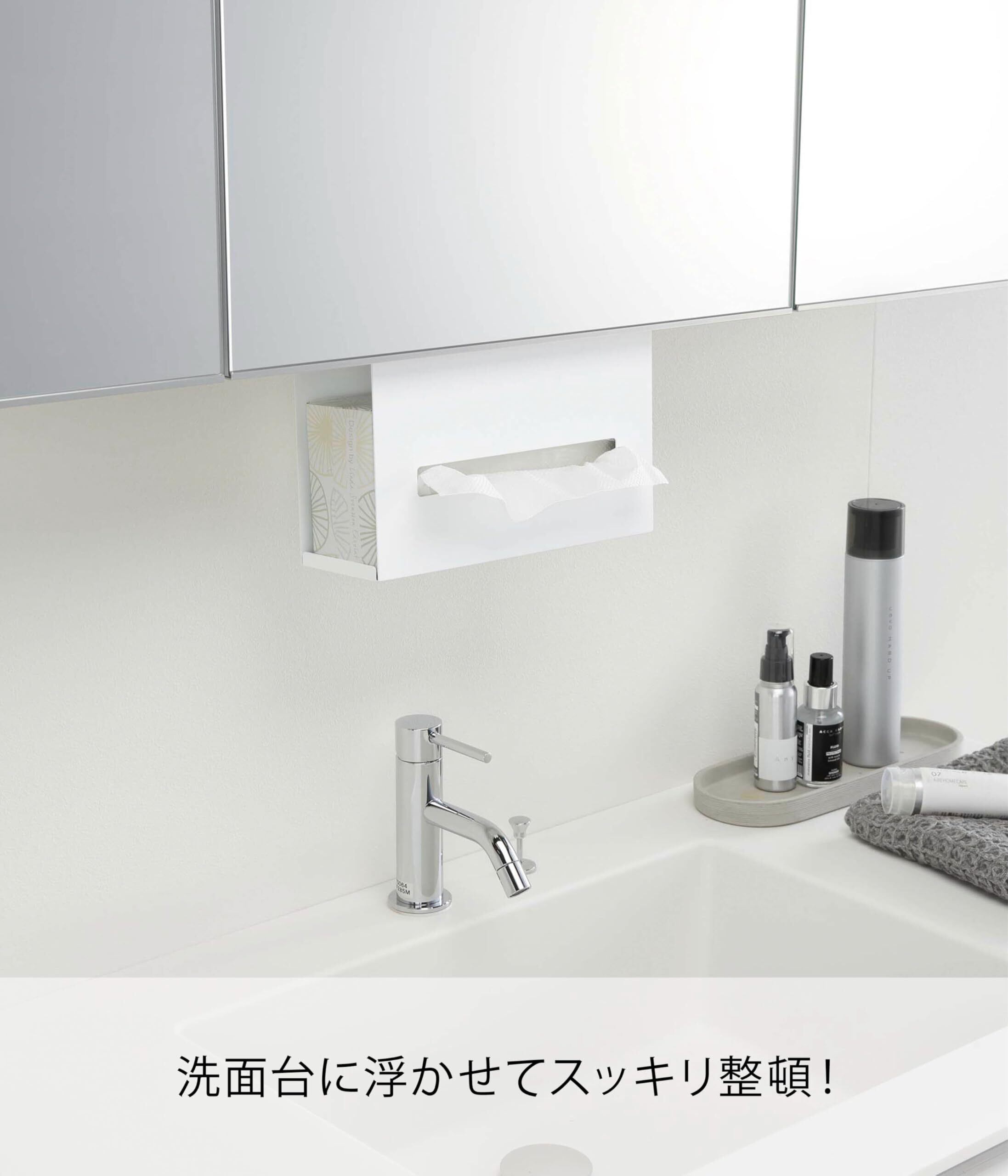 洗面所の吊り戸棚に浮かせて取り付けられるペーパーボックスホルダー! 洗面台に浮かせてスッキリ整頓! 横から入れ替えるだけの簡単収納。