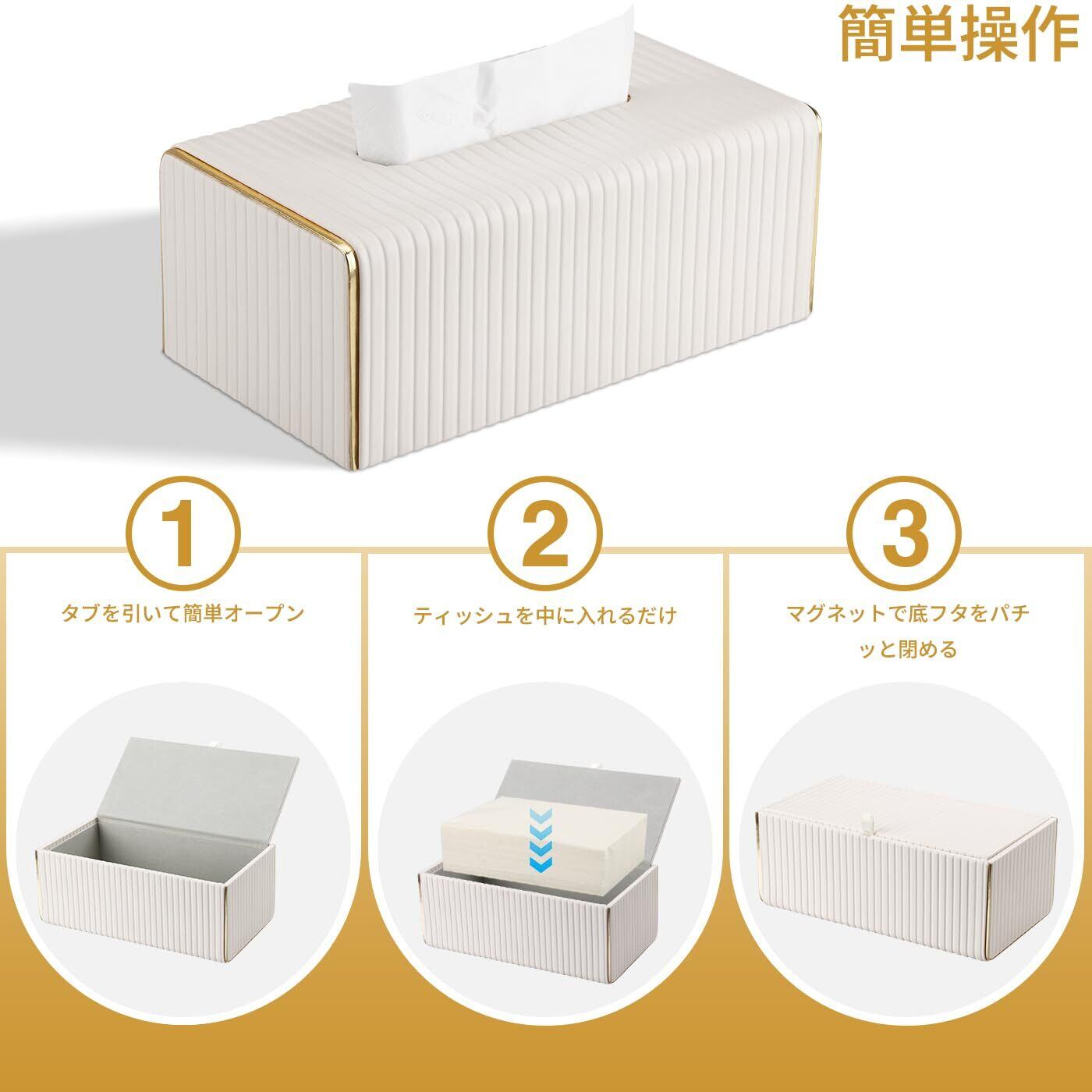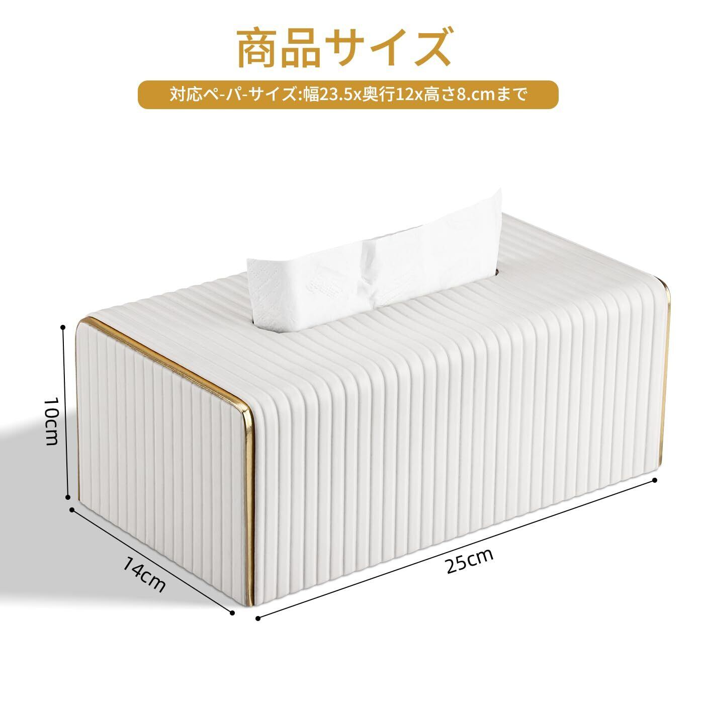 ティッシュケース ティッシュボックス レザー調ストライプティッシュケース 展開 ブラック/ホワイト/ヌード/ライトグレー × ゴールドライン PUレザー製 ティッシュボックス カバー (ホワイト)