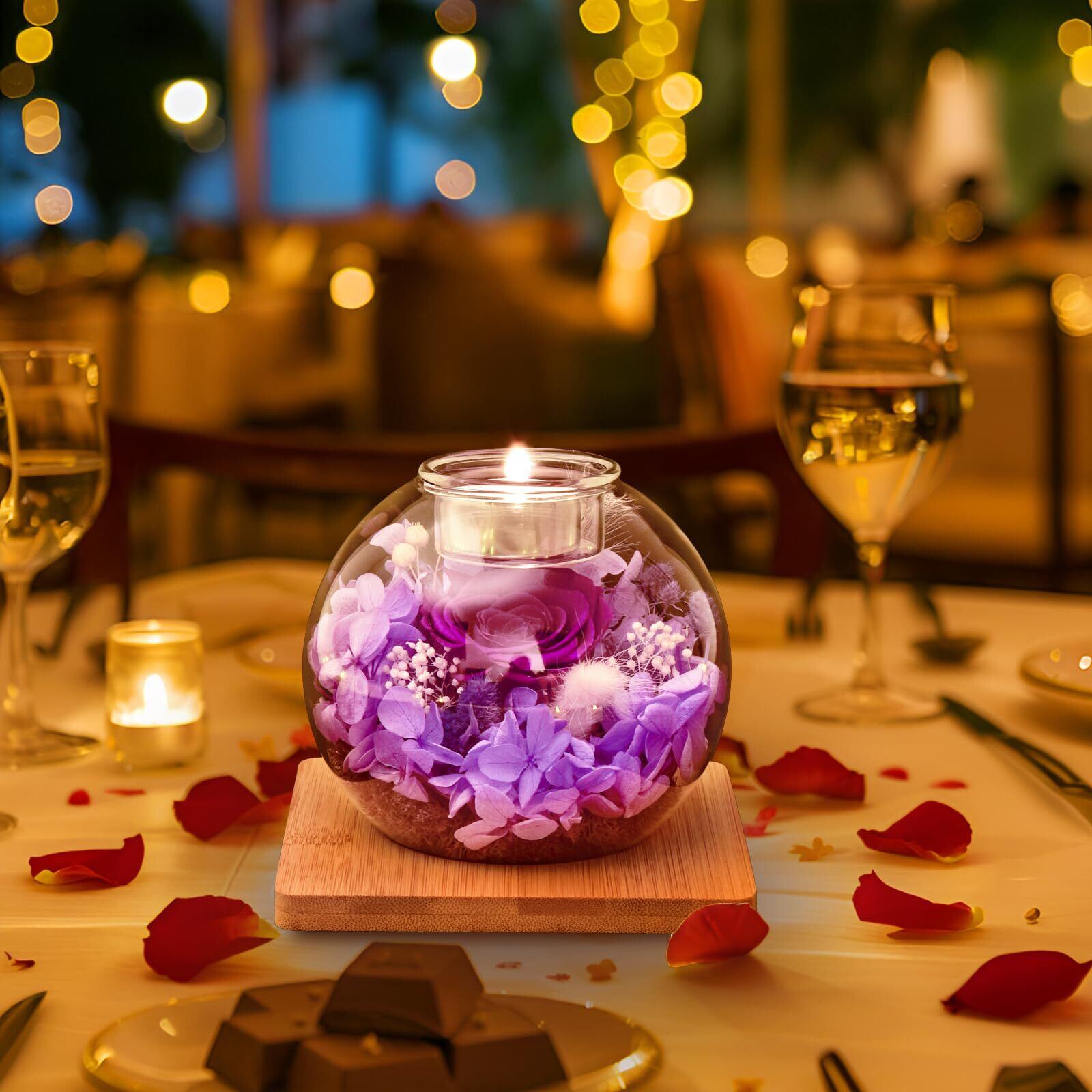 母の日 プリザーブドフラワー プレゼント ブリザードフラワー ガラスドーム 優雅なバラキャンドルホルダー (紫)