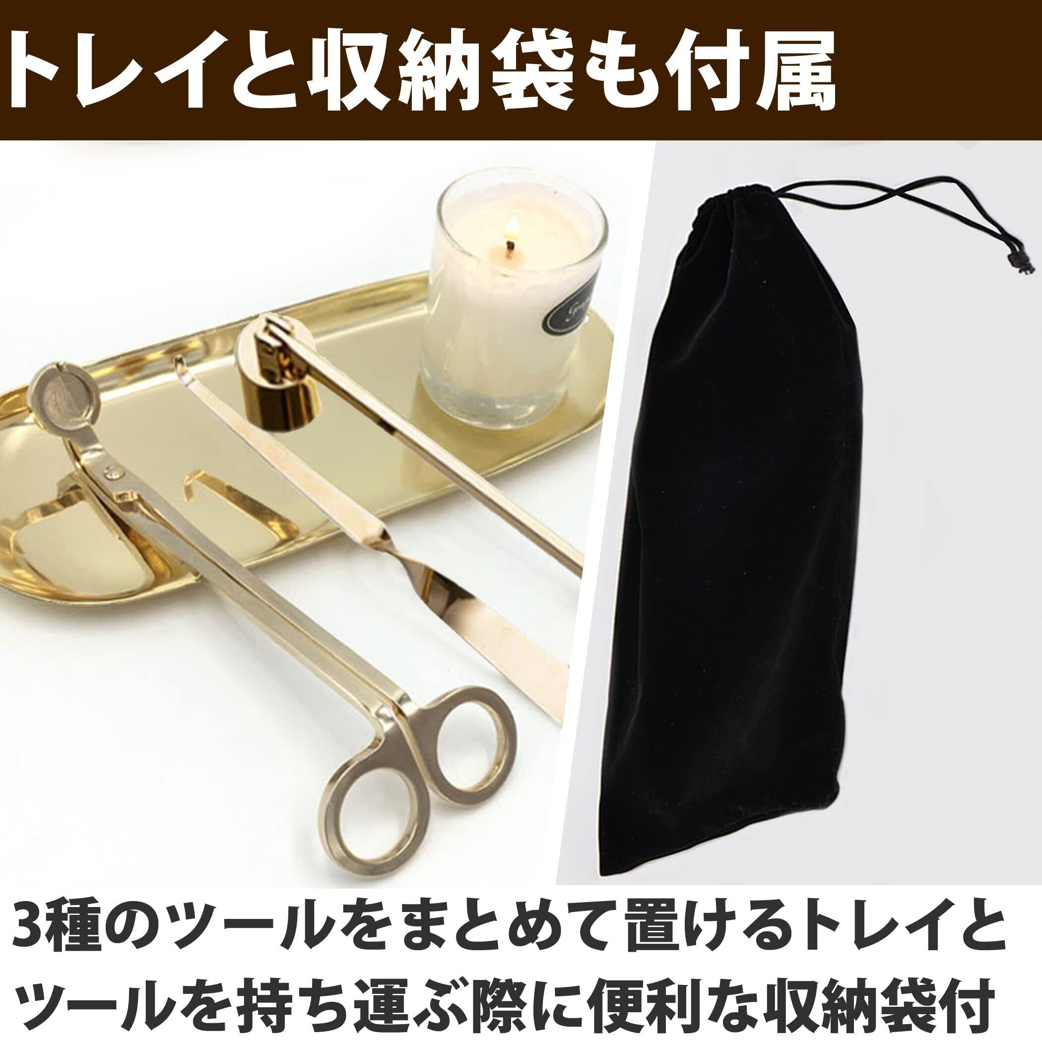 セット内容:ろうそく消し(全長:約22.8cm)、芯切りばさみ(全長:約18.1cm)、ウィックディッパー(全長:約19.7cm)、トレイ(サイズ:約22.9×9.5cm) カラー:ゴールド 材質:ステンレス 付属品:収納袋(サイズ:約25.3×11.5cm カラー:ブラック) ※モニターの環境等により、色の見え方に若干差が生じる場合がございます。