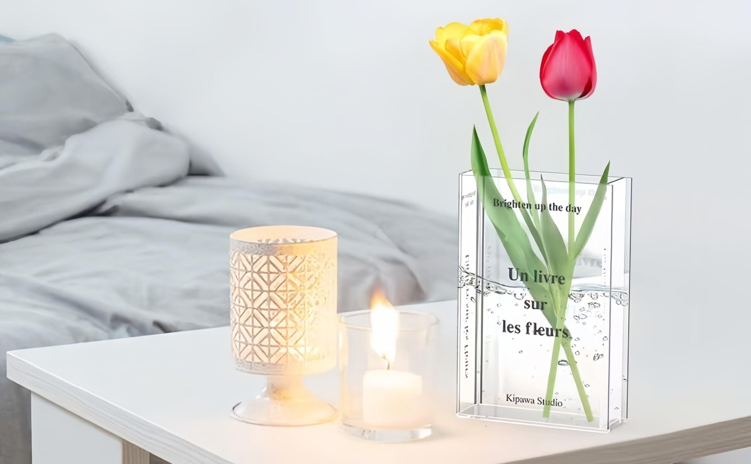 「DFUASIBC 透明花瓶」は、本をモチーフにした独特なデザインが特徴のアクリル製花瓶です。高さ18cmのコンパクトなサイズは、省スペースでありながら存在感を放ち、リビングやオフィス、書斎などの卓上インテリアに最適です。