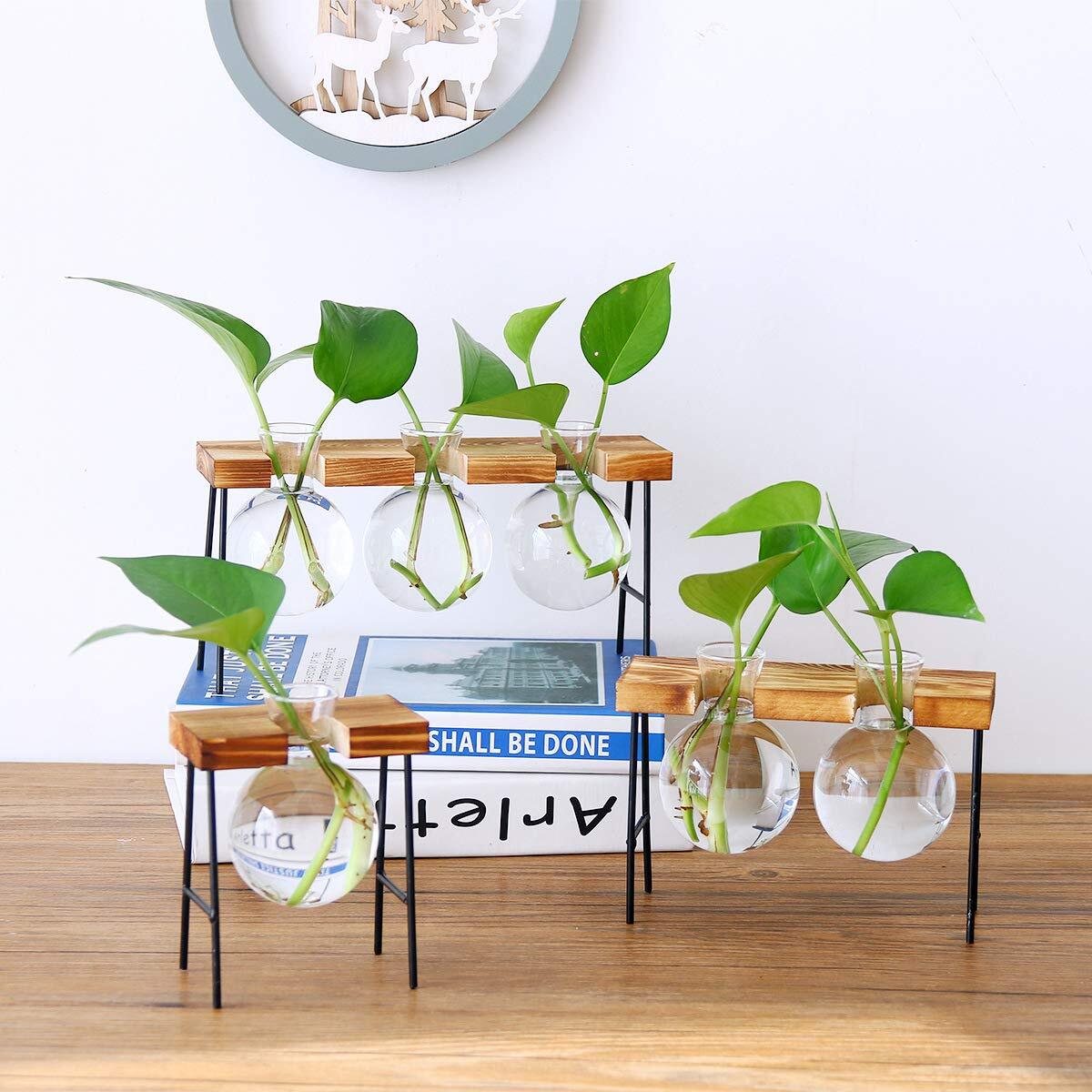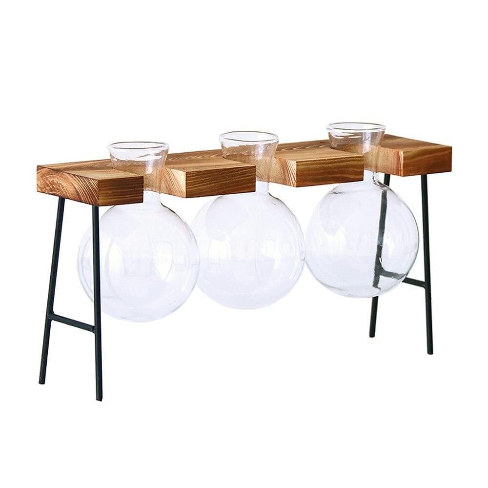 moin moin フラスコ 花瓶 一輪挿し 植木鉢 ガラス 木製フレーム おしゃれ アイアン (ブラウン ボトル 3ヶ) 2105fb8