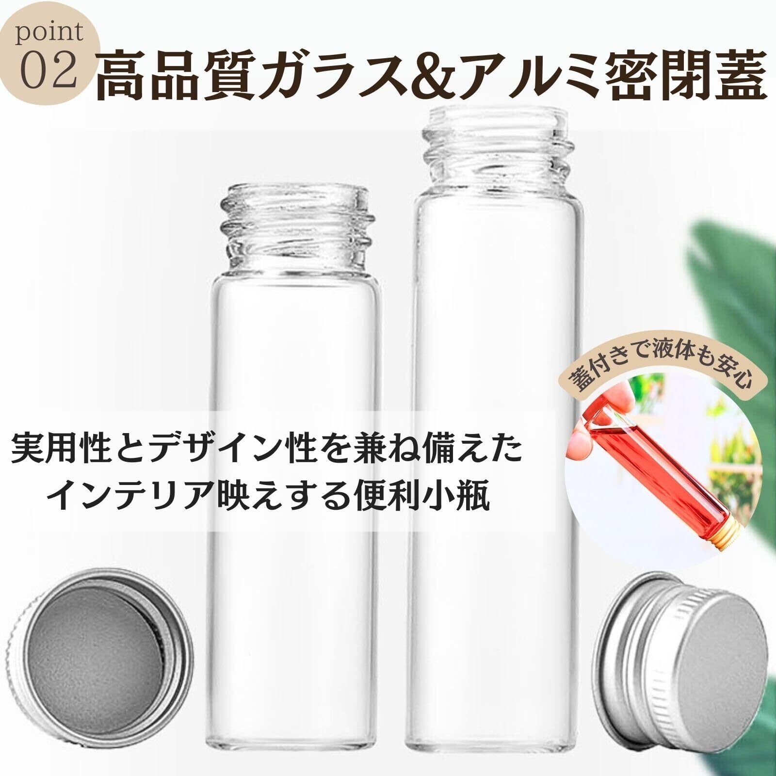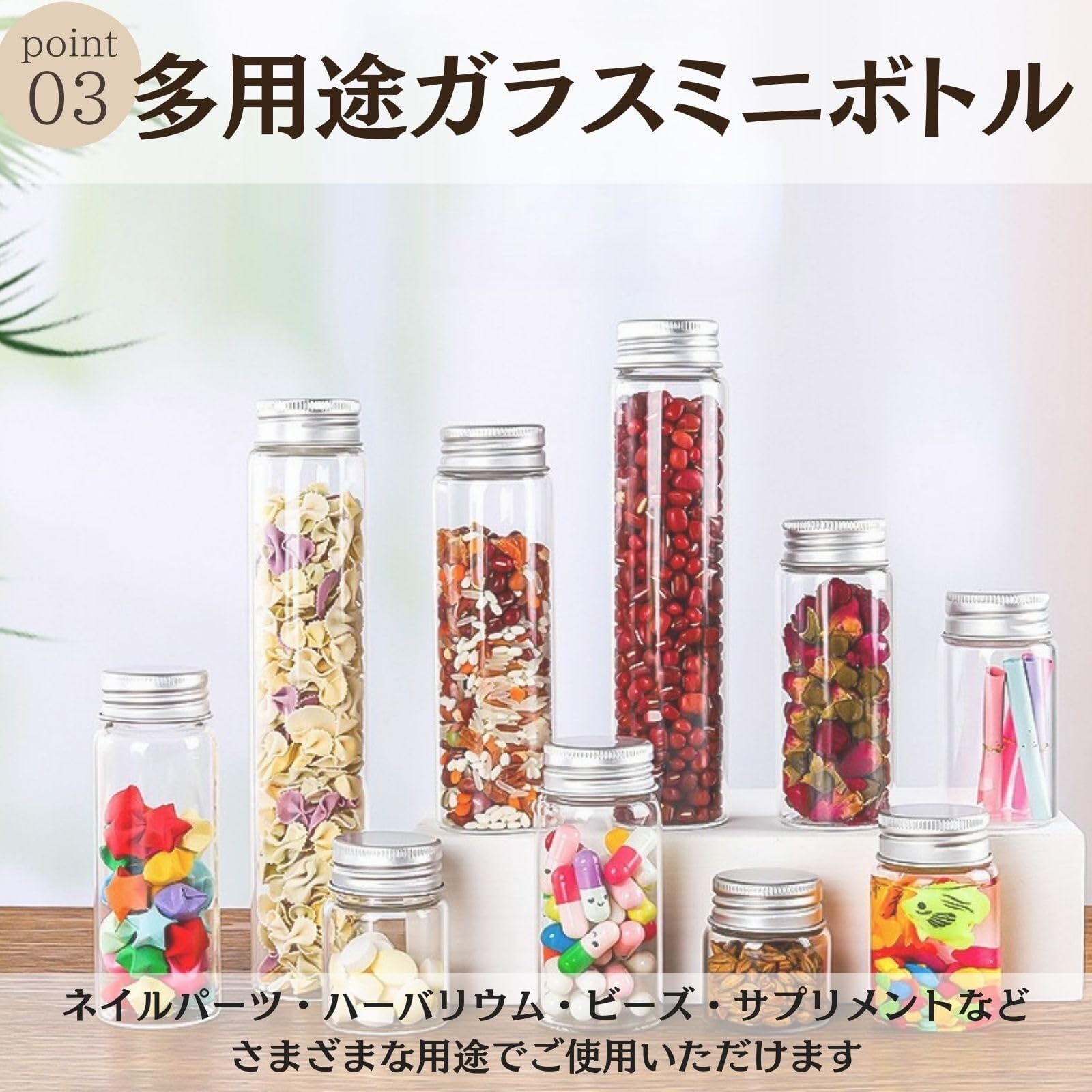 【高品質ガラス&密閉蓋で安心保存】透明度の高いガラス製の小瓶で、ビーズや天然石、香水、アロマオイルなどの収納に最適。アルミキャップがしっかり密閉し、液体も安心保存。サンプル容器やインテリアとしてもおしゃれに活躍する万能ミニボトル!デコパーツやハーバリウムのディスプレイとしても活躍し、実用性とデザイン性を兼ね備えたアイテム。