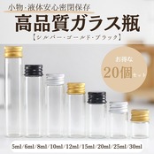 【商品詳細】<20個セット>本体サイズ:画像参照、容量:5ml / 6ml / 8ml / 10ml / 12ml / 15ml / 20ml / 25ml / 30ml、キャップカラー:シルバー / ゴールド / ブラック