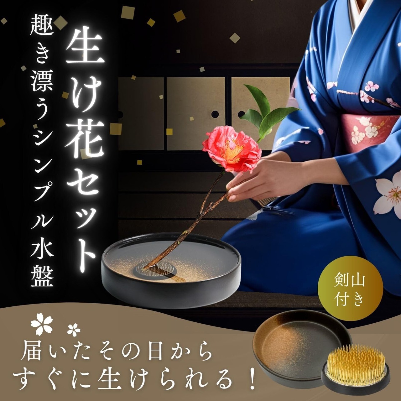 【届いたその日から始められる生け花セット】 初めての方でもすぐに始められるよう、陶器製の丸型水盤(直径20cm)と、安定感のある金属製剣山(直径7cm・滑り止めゴムリング付き)をセットにしました。道具選びで迷うことなく、生け花を始めるハードルをぐっと下げてくれる基本セットです。フラワーアレンジメントに初挑戦したい方はもちろん、久しぶりに華道を再開したい方や、手軽に季節の草花を飾りたい方にも最適。箱を開けたその瞬間から、生け花の世界が広がります。初心者から上級者まで満足できる、実用性と品格を兼ね備えた本格仕様です。