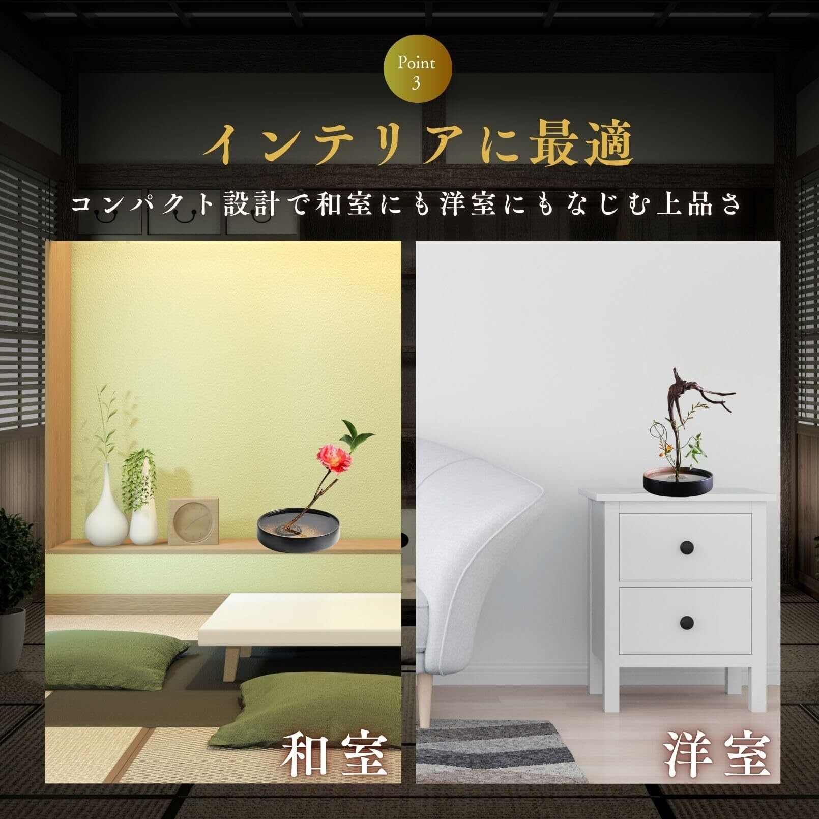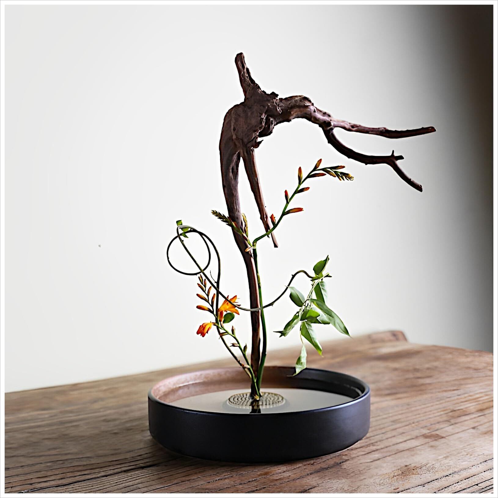 【和洋問わず映える上品な黒茶デザイン】 水盤は落ち着きのある黒茶色で、陶器ならではの深みと艶感が特徴。丸みを帯びたシルエットが草花の美しさをやさしく引き立て、主張しすぎず調和をもたらします。和室にもしっくり馴染み、洋室に置けばモダンなアクセントに。華道の稽古道具としてはもちろん、お部屋や玄関のインテリアとしても活躍します。小さな草花ひとつでも空間がぐっと洗練され、静謐な趣を添えてくれる逸品。季節の移ろいを感じられる飾り台として、日常に心のゆとりを届けてくれます。