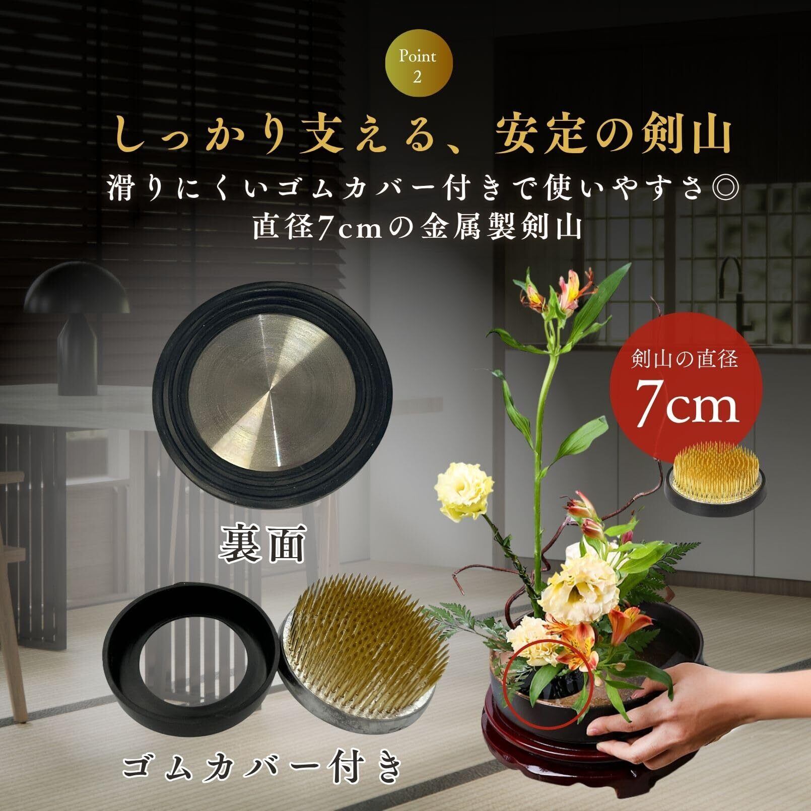 【剣山付きで花材がしっかり固定できる安心感】 剣山は直径7cm・高さ2.5cm、針長1.5cmの本格派。安定感のある金属製で、茎が細い草花から枝ものまでしっかりと固定でき、美しい角度を保てます。さらに滑り止めのゴムリング付きなので、水盤内でズレにくく、安心して繰り返し使用できます。初めて剣山を扱う方でも扱いやすく、花材の配置に自信がない方でもスムーズに形を整えることができます。剣山特有の「挿す楽しみ」も味わえ、自由な発想で花を生ける楽しみを実感できるのが魅力です。