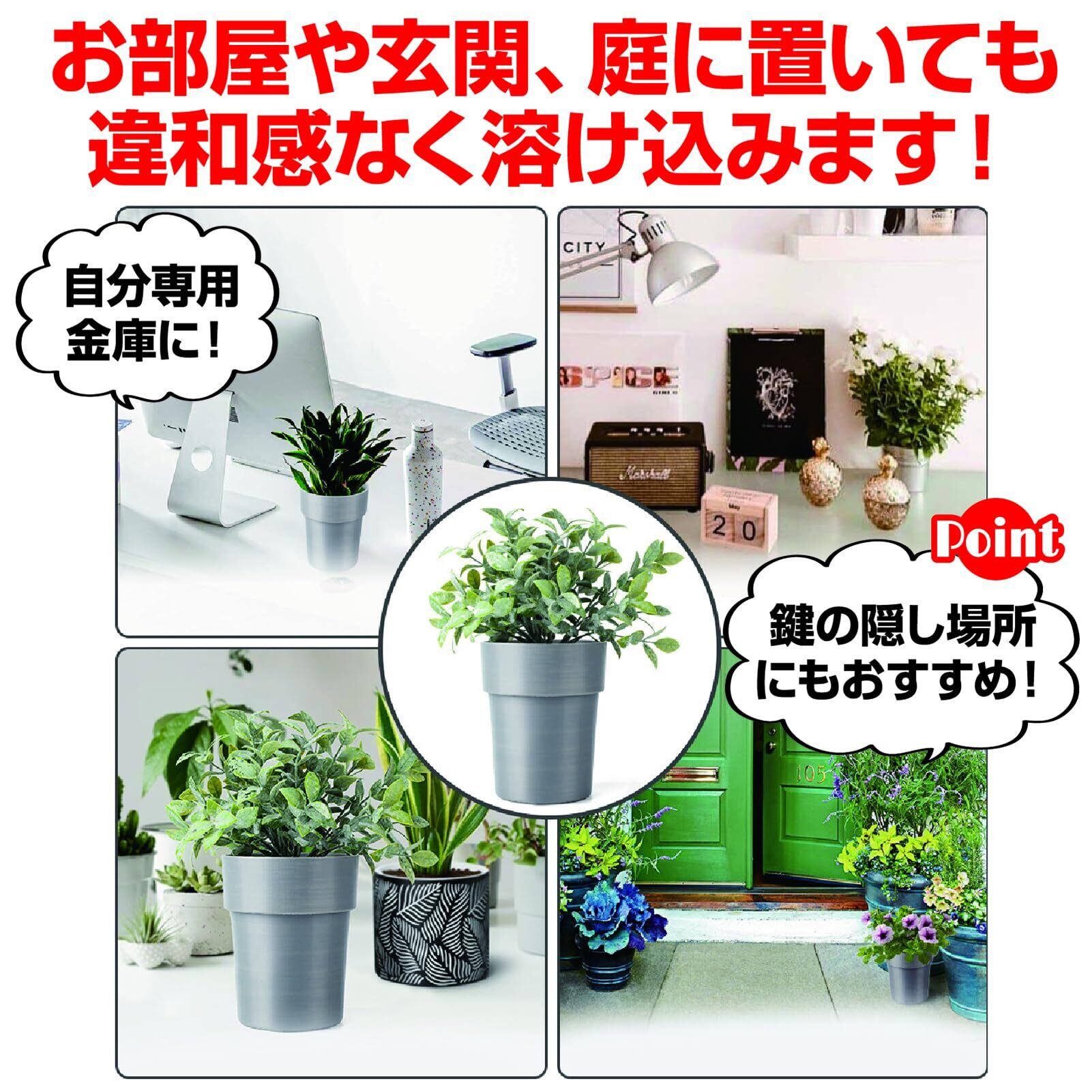 植木鉢が上げ底になっており、鍵やお金、ジュエリーなど小さな貴重品を隠せます。上には人口観葉植物、フェイクグリーンが飾られており、ちょっと見ただけでは金庫だとバレません。