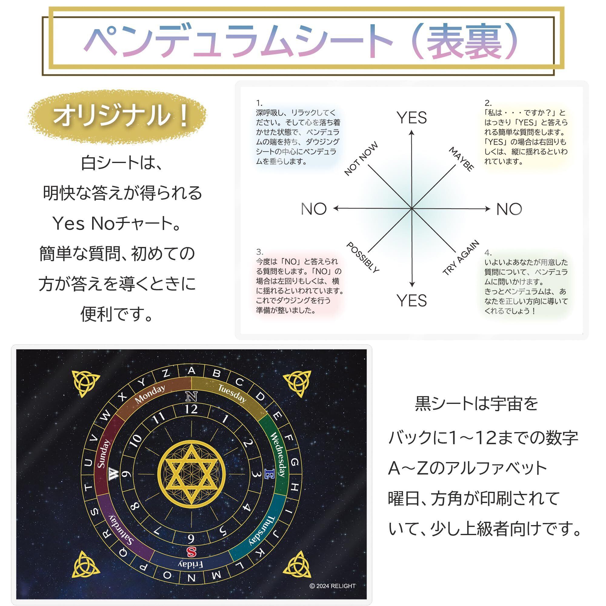 【用途】ペンデュラムはダウンジングに使われる振り子の事で、恋愛占いなどから色々な占いに使われている最も簡単な占いツールの一つです。また、付属のペンデュラムチャートで届いたその日から占いを始めることができ、初心者の方でも占いを始めやすいセットになっております。