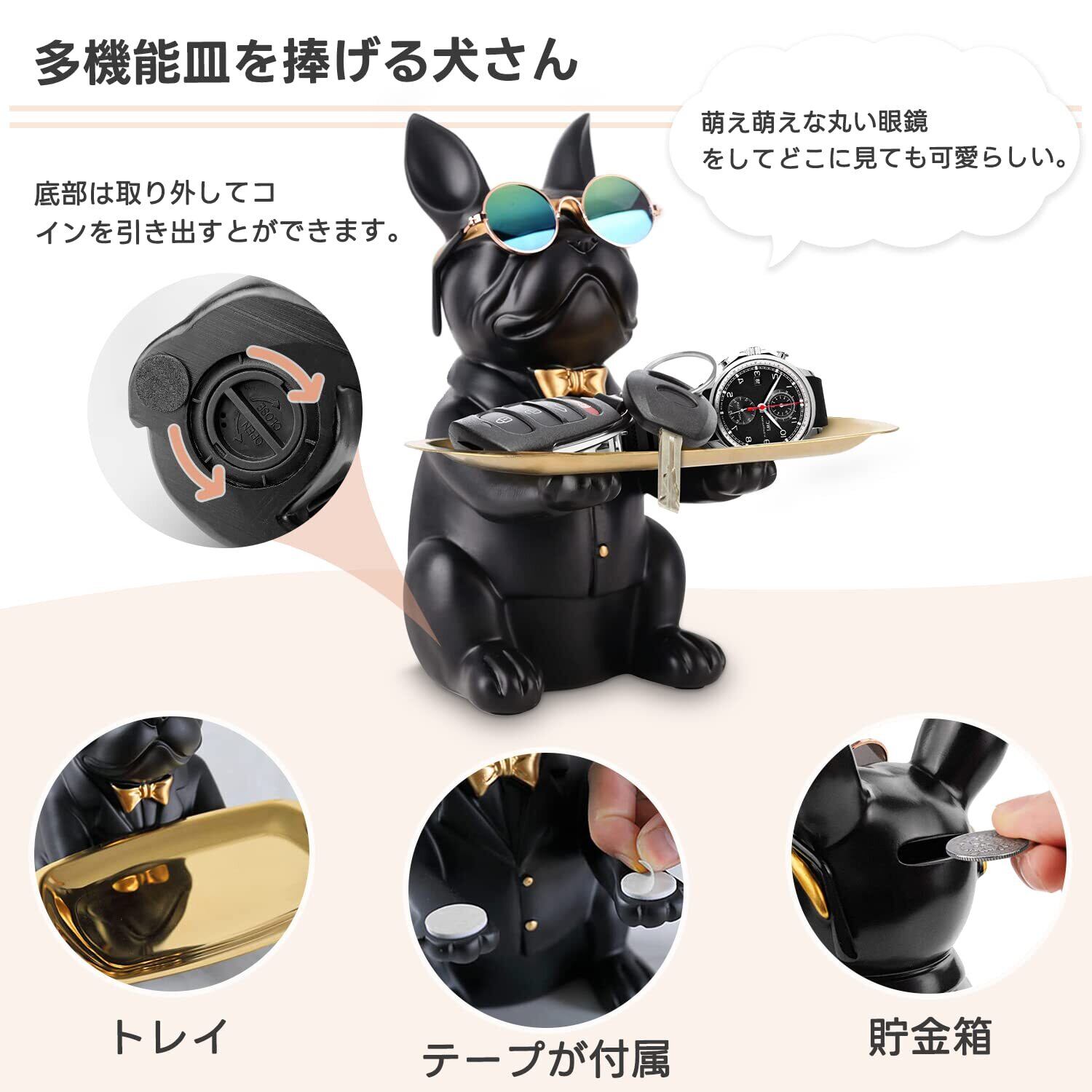 [ 多機能皿を捧げる犬さん ] 存在感のあるシュールな置物+貯金箱+収納トレイ ギフト:ステンレス鋼トレイ 収納トレイは鍵、眼鏡、リモコンや化粧品など小物置きです。貯金箱機能のおかげで、子供たちのためにお金を節約する良い習慣を育むこともできます 。貯金が苦手な人でもプチ贅沢貯金として貯金が楽しめます。