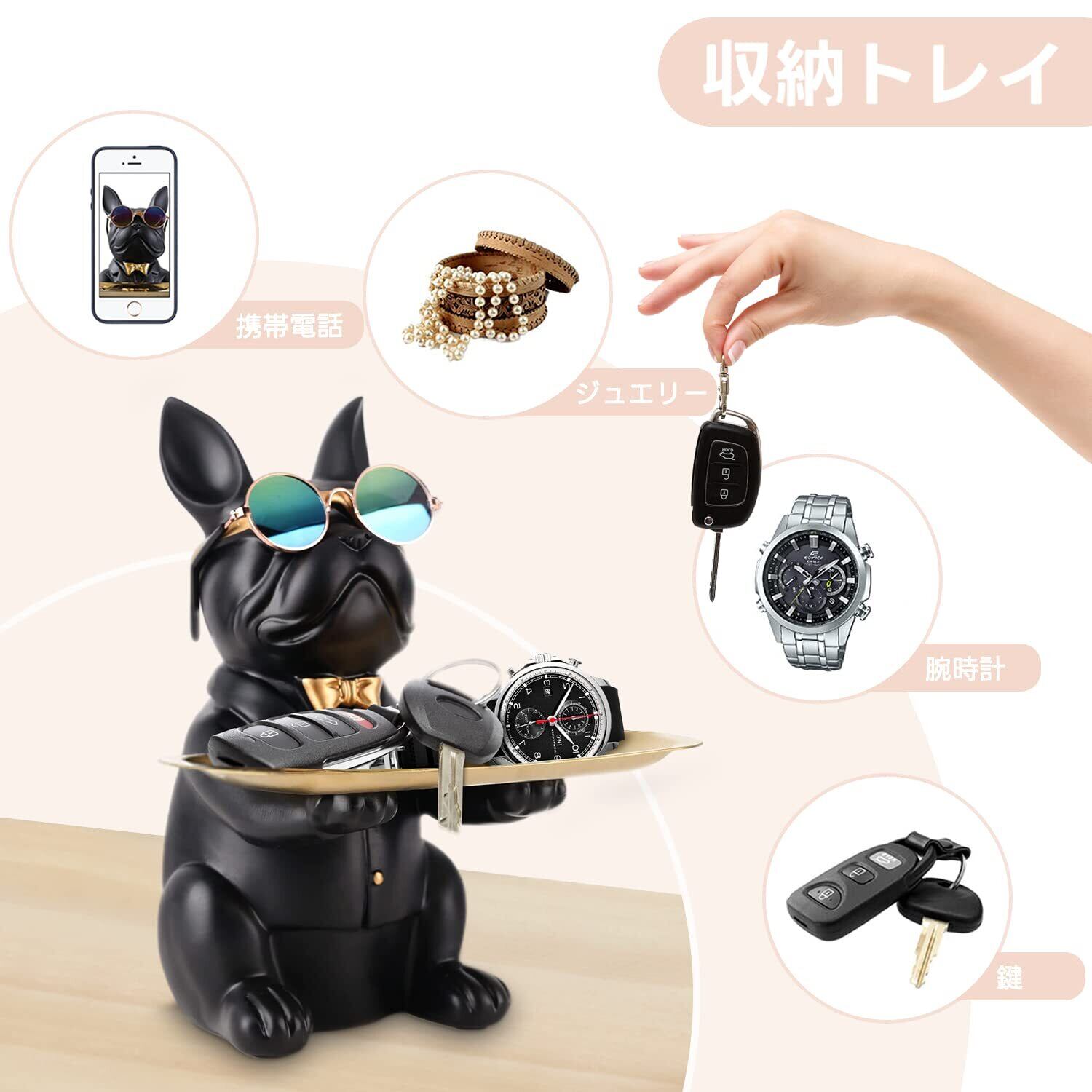 [ 便利な小物収納 ] 雑貨置物収納トレイとして、携帯電話、鍵、メガネ、リモコンなど小物を収納できるだけでなく、キャンディー収納皿や貯金箱としても幅広く応用されています。ブルドッグトレイは、イヤリング、リング、ブレスレット、ネックレス、口紅、香水、プレス粉、ローション、ヘアアクセサリーなどのジュエリー を整理して使いやすくします。清潔で整頓されたスペースを維持することは、時間とスペースを管理するのに役立ちます。