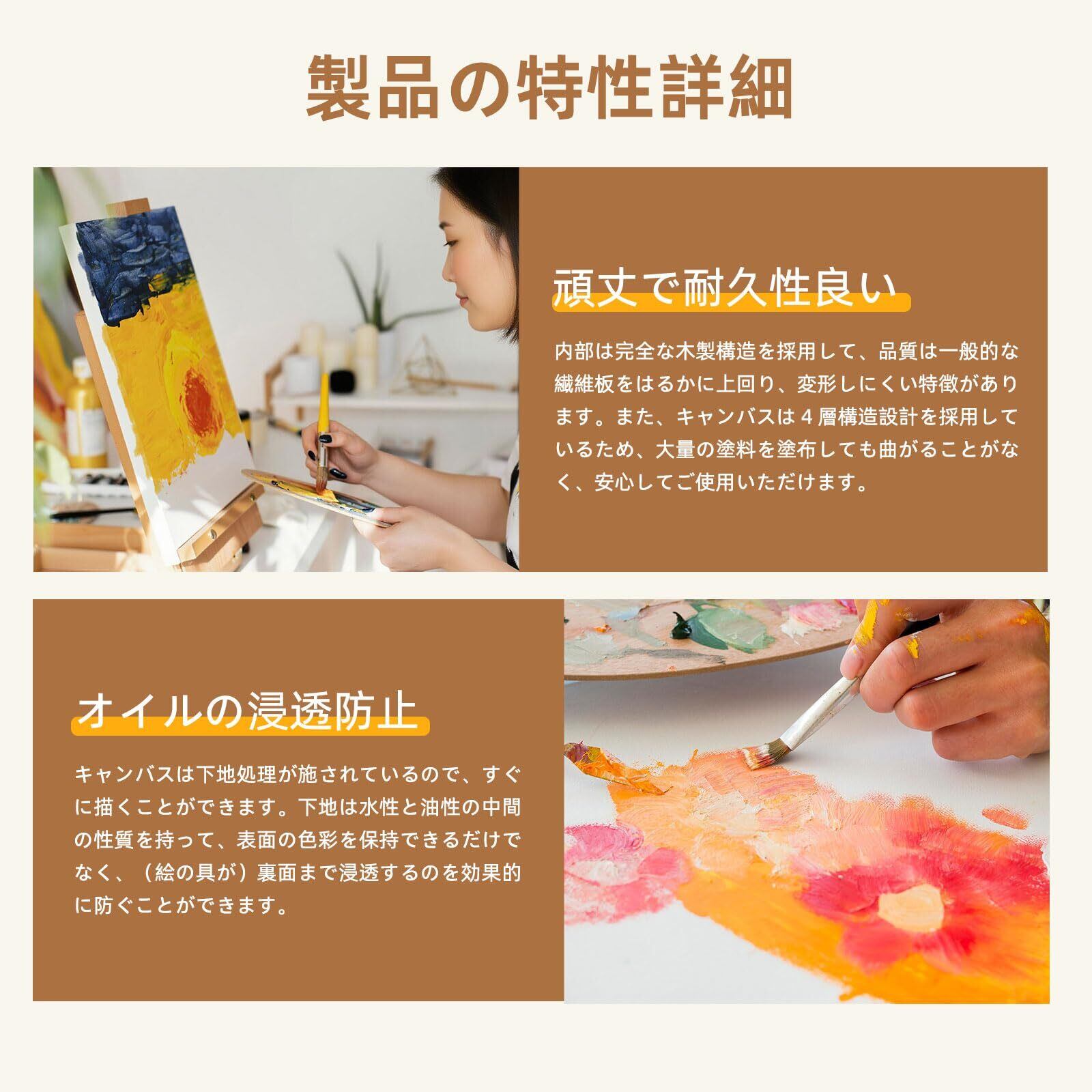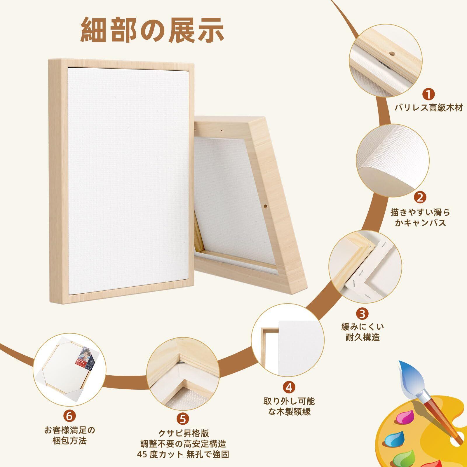 【卓越な素材、安定した構造】キャンバスは4層構造で設計されて、大量の塗料を塗布しても曲がることがなく、地は水性と油性の中間の性質を持って、表面の色彩を保持するだけでなく、裏面まで浸透するのを効果的に防ぐことができます。内部は完全な木製構造の額縁を採用しており、品質は一般的な繊維板よりはるかに優れ、変形しにくいです。さらに、取り外し可能な木製額縁が付属して、木目がはっきりしていて、バリがなく、職人が手作業で丁寧に磨き上げて完成させました(手作業の痕跡があるのは正常な現象です)。