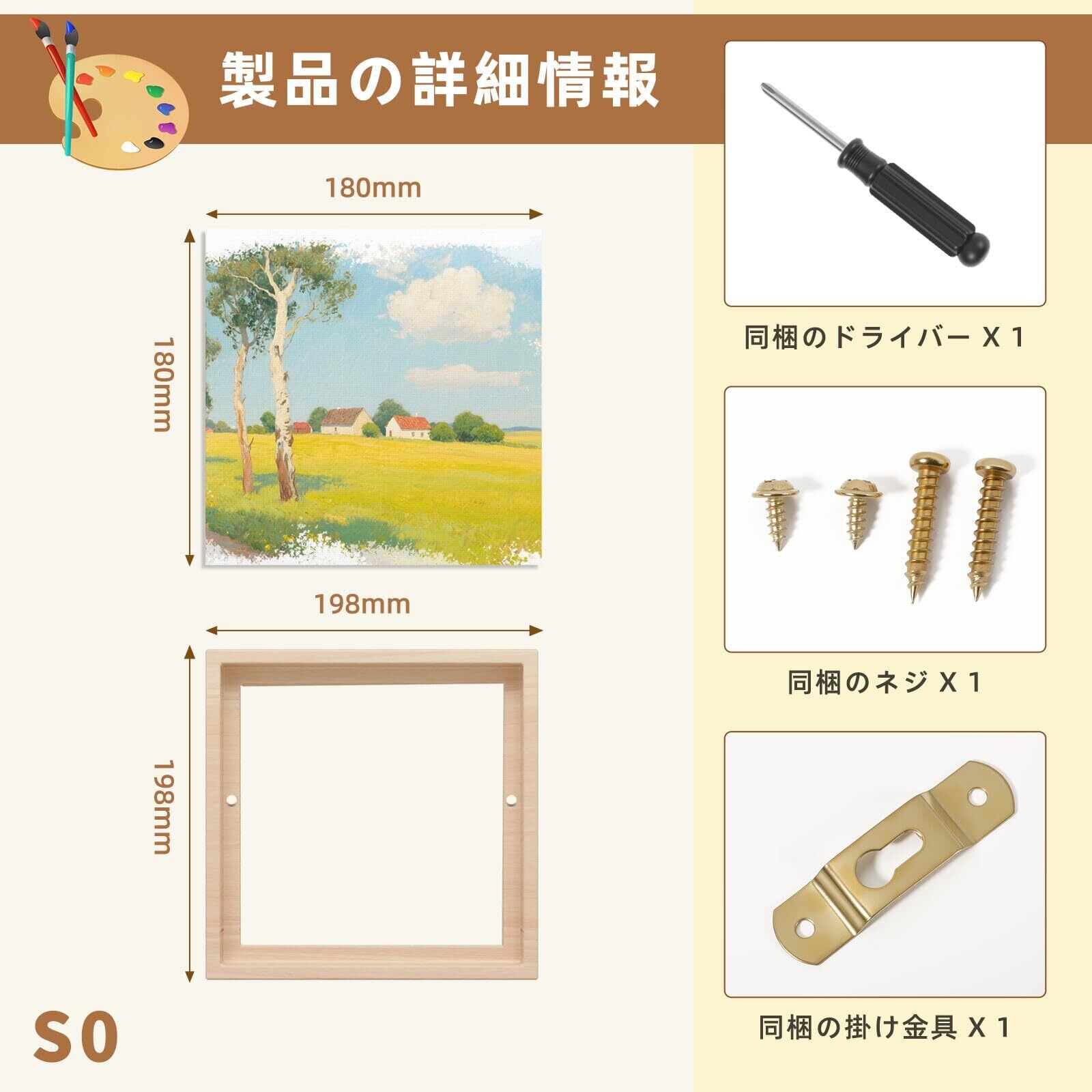 【梱包は安心、工具もそろって】S0のサイズ:180mmx180mmx15mm。(額縁のサイズは含まれません)全体は高品質の包装フィルムで包装されて、コーナーにも特別に保護設計が施されていて、キャンバスと額縁が損傷したり汚染されたりするのを効果的に防ぐことができます。梱包内容:キャンバス*1、木製額縁*1、磁気ドライバー*1、ネジ*4、掛け金具*1。