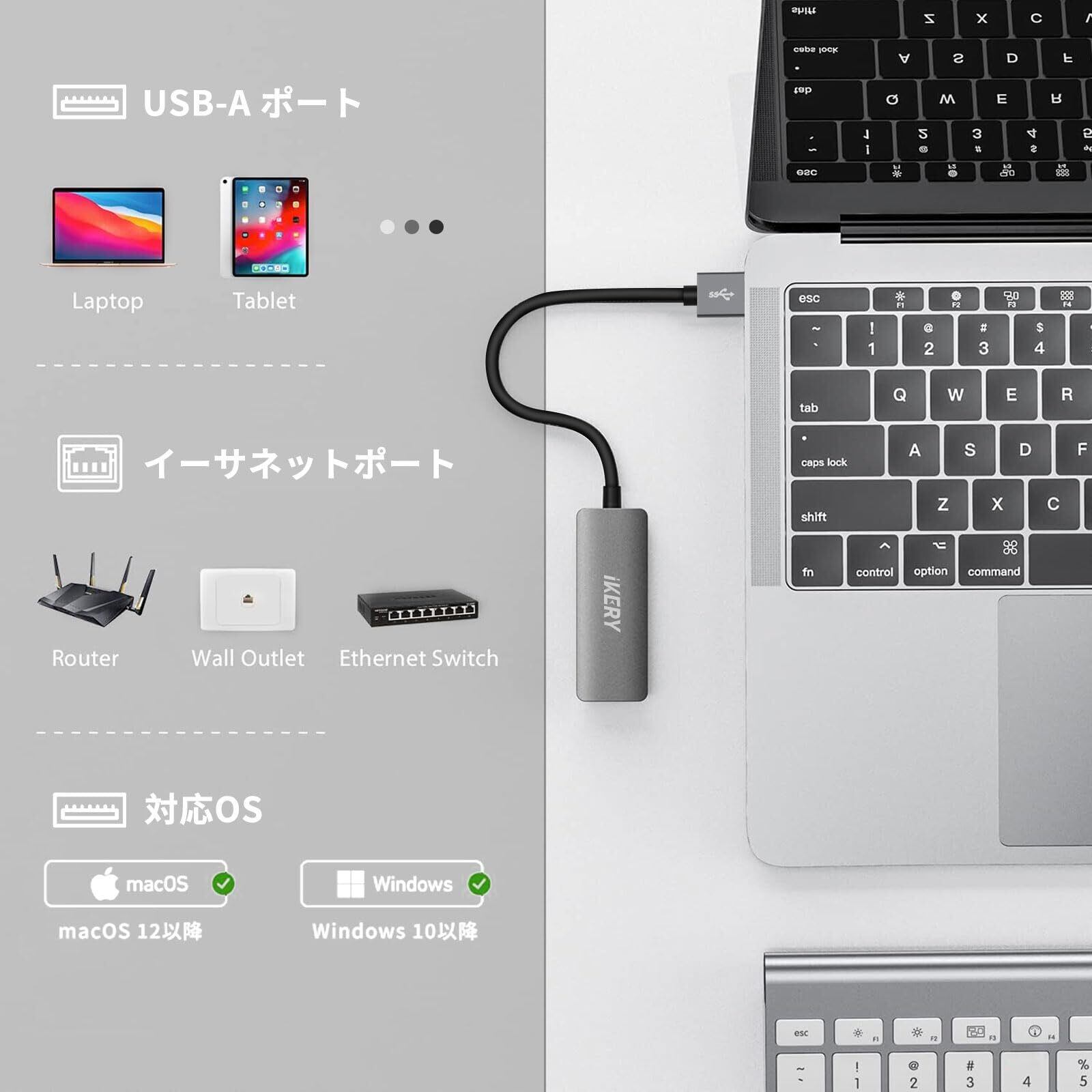 IKERYのアダプターは、MacBookやiPad Pro、iMacはもちろん、Windows PCやその他のUSB-Aデバイスにも幅広く対応しています。多様な環境でお使いいただくための理想的な選択肢です。