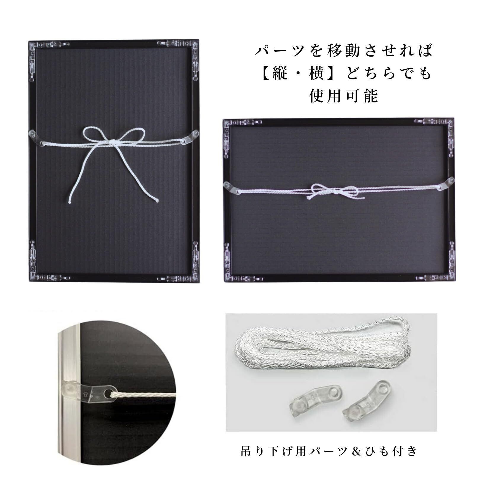 フレームの吊り下げパーツとヒモも付属。壁に掛けた時、裏面からかけひもが見えません。表面には1mmの透明シートを使用。
