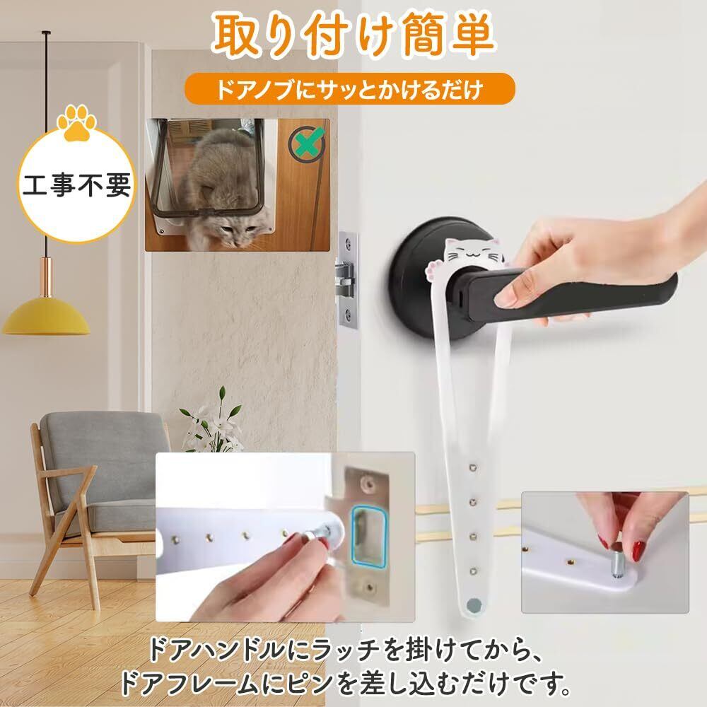 猫が自由に出入りできる快適な空間をつくる! ドアのハンドルに引っ掛けてピンを差し込むだけで、ドアに安全な隙間を確保できます。 ペットが挟まれる心配を防ぎ、空気の流れもよくなる優れもの。 5段階調整可能。2枚重ねることでさらに赤ちゃんや犬のためにスペースを広げることも可能! 軽量で丈夫。取り付けは工具不要です。