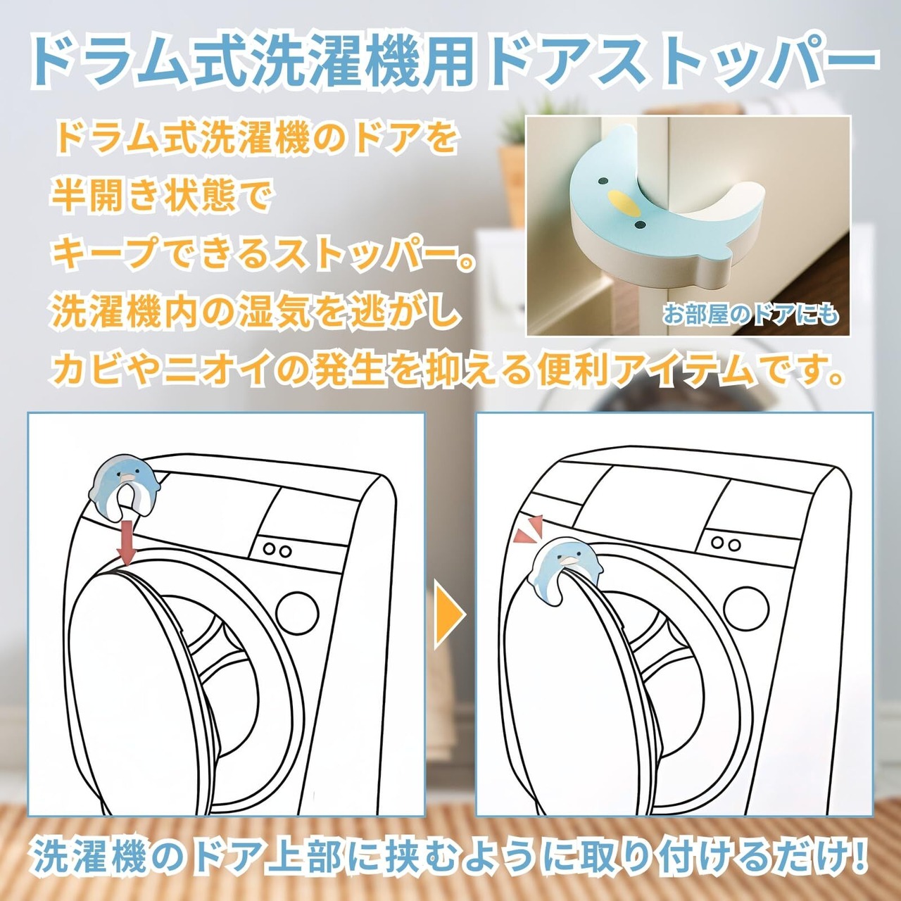 ドラム式洗濯機のドアに挟むことで隙間を作り、洗濯機内の湿気を逃がします。