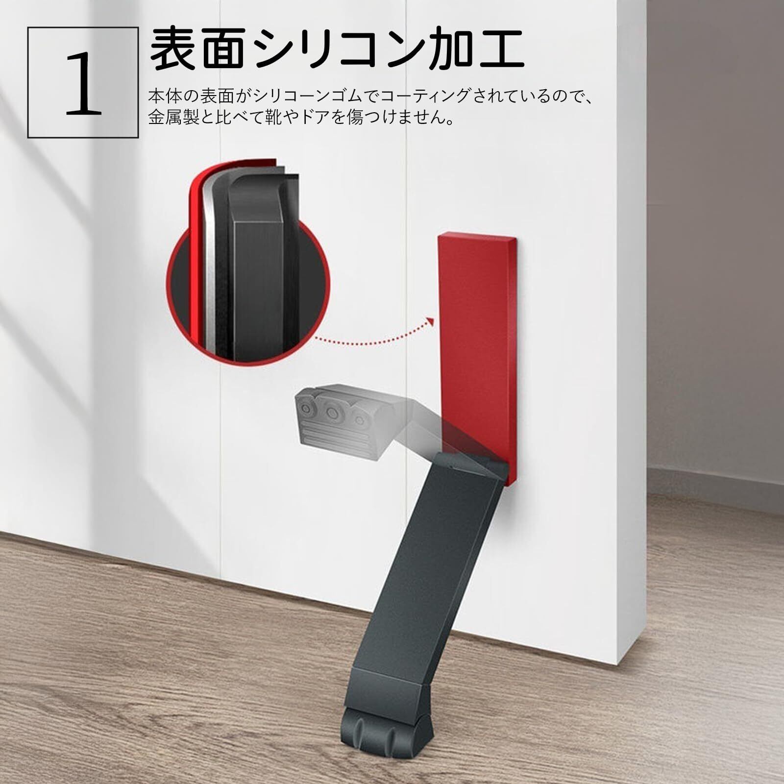 【シリコン外装+自動調整滑り止めゴム足】当社の玄関ドアストッパーは表面がシリコーンゴムでコーティングされているため、単に金属製のものと比べて床や靴を傷つけません。操作時の「ガタン」という音も軽減し、静かな生活空間を実現します。そして、従来品より大きな滑り止めゴムを採用し、グリップ力がさらに強力。しかも、地面の凹凸に合わせて左右自動調整可能! 軽微な傾斜にも対応し、しっかり固定されてズレません!ゴム足はネジ固定式だから、落下や紛失のリスクゼロ!