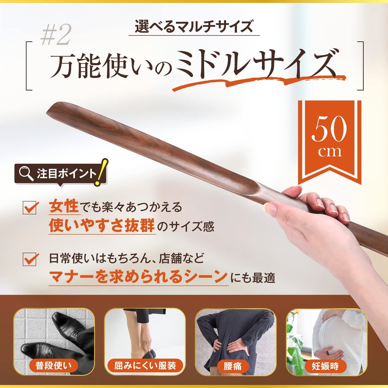 28cm、50cm、75cmの3サイズをご用意。お好みや使用シーンに応じて最適なサイズをお選びいただけます。それぞれのサイズは、立ったままでも楽に靴を履けるよう設計されており、特にご高齢者や身体に不安のある方にとっても使いやすい工夫がされています。