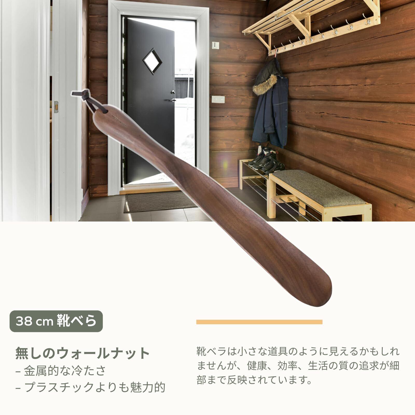 38cmのサイズ感は様々な靴に対応し、立ったままでも使用しやすい設計です。持ちやすい形状で、靴を履く際もスムーズにサポートします。特に高齢者の方や妊婦の方にも優しい配慮がなされています。