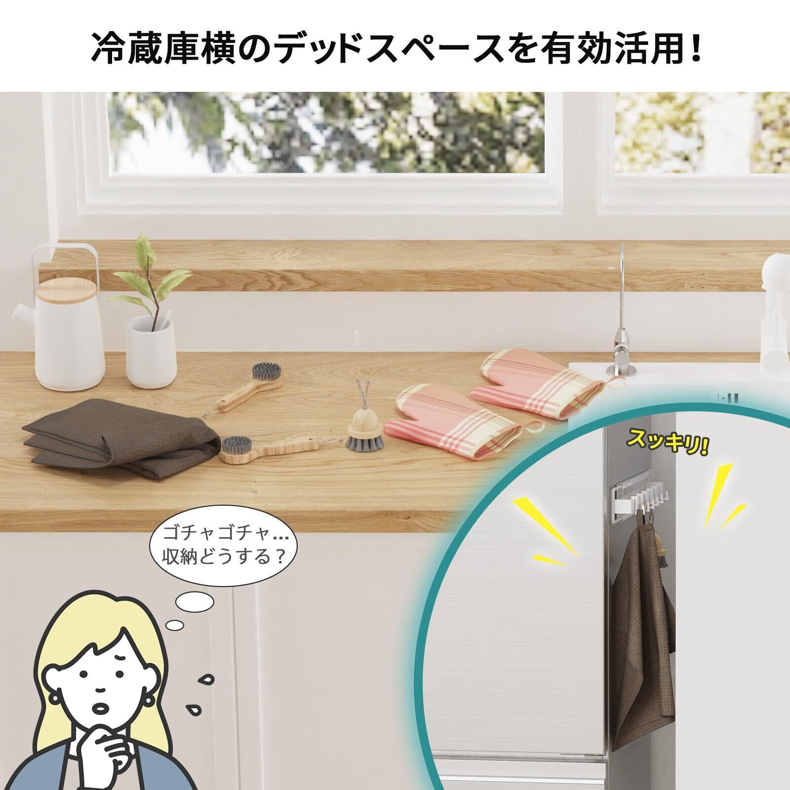 「冷蔵庫横の隙間を収納スペースに」冷蔵庫と壁のデッドスペースを、マグネットでスッキリ有効活用!エプロンやエコバッグ、掃除道具など、生活感が出やすい小物もスマートにまとめて収納。※取り付けには、冷蔵庫と壁面の間に約10cm(腕が入る幅)の隙間が必要です。