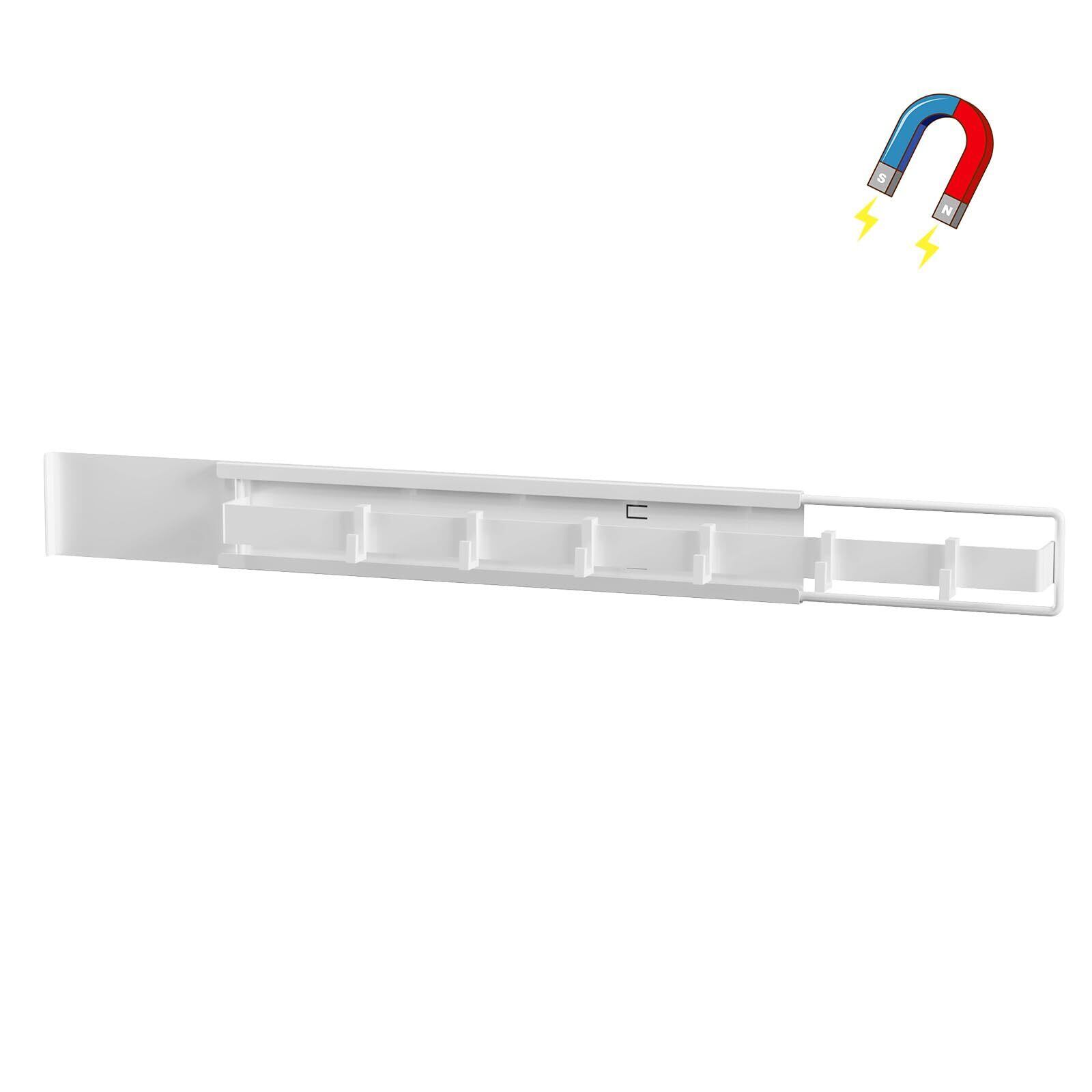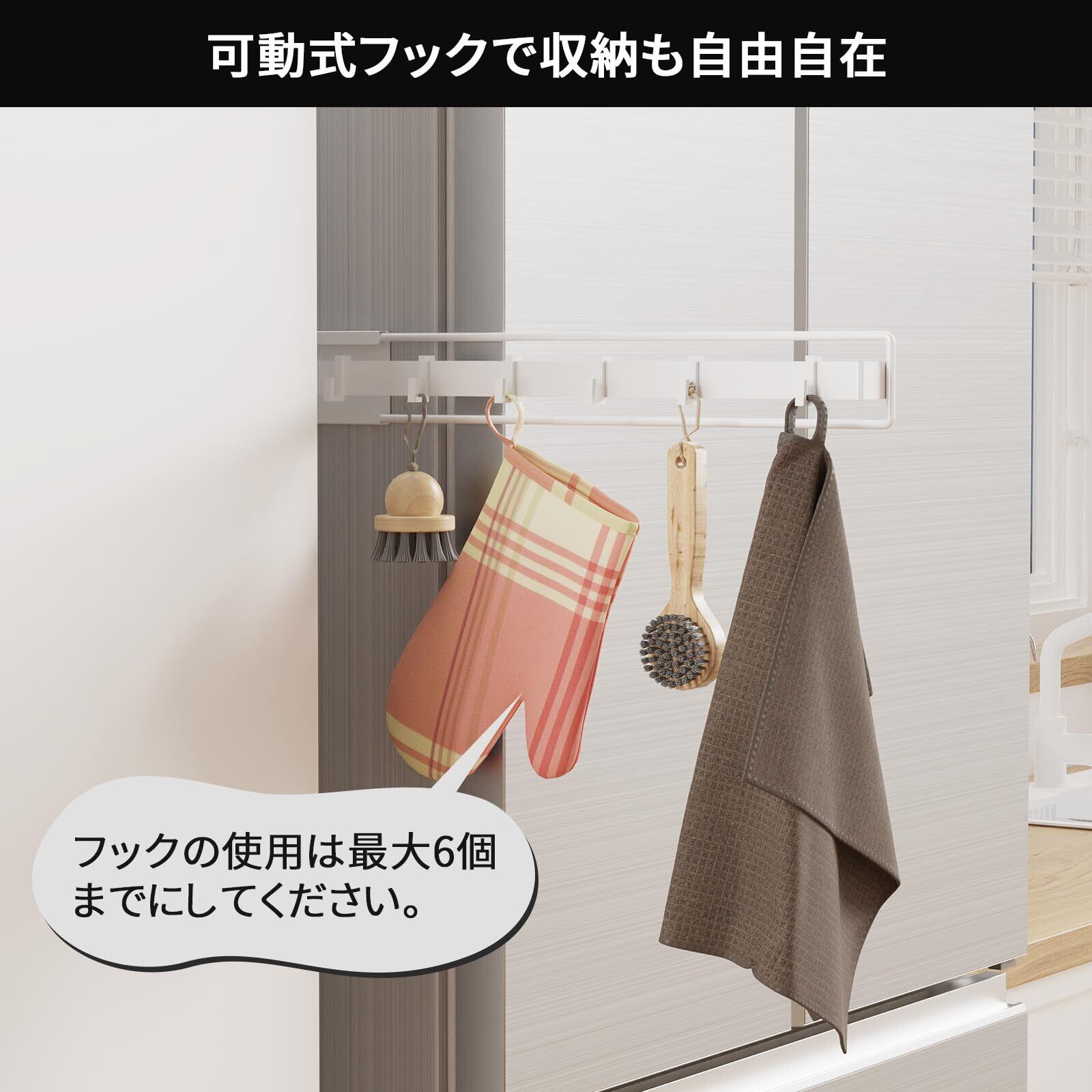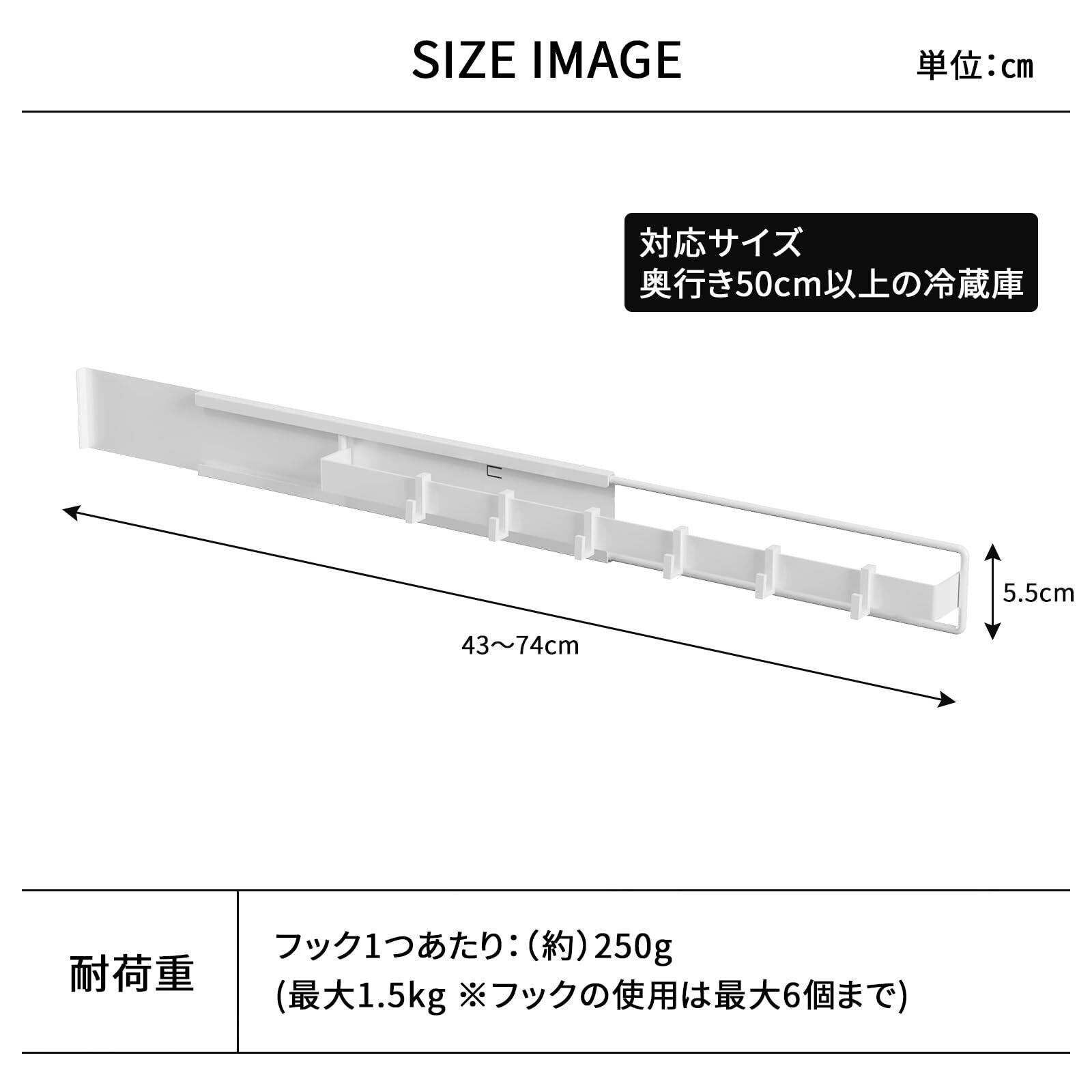 「品質表示」商品サイズ:₍約₎W1×D43~74×H5.5cm 対応サイズ:奥行き50cm以上の冷蔵庫 本体材質:スチール(粉体塗装)、マグネット 耐荷重:フック1つあたり:₍約₎250g (最大1.5kg ※フックの使用は最大6個まで。)