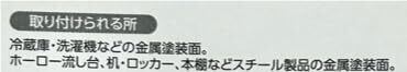 ご自宅の冷蔵庫、洗濯機などの金属塗装面、学校や職場の机、ロッカー、本棚などのスチール製品の金属塗装面に取り付け可能です