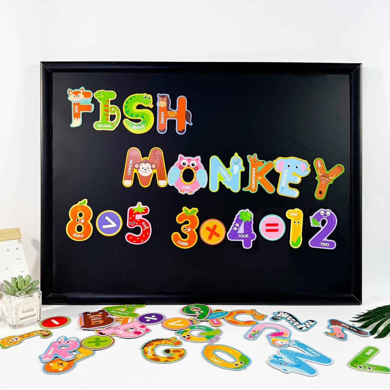 "【創造力】全43pcs(アルファベット、数字、符号)で単語つくりや数字遊びが自由に楽しめます。想像力が広がる組み合わせです。 例:「BEAR + RUN =クマが走る」 「TWO + PIG =2匹のブタ」