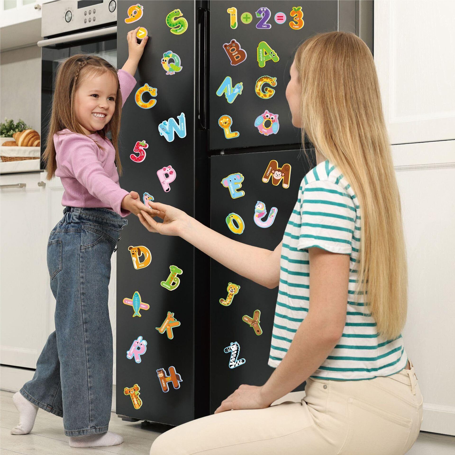 【楽しく学べるデザイン】熊、犬、像等の人気動物イラストに加え、「ONE」「RUN」等の英単語や数字を組み合わせたマグネットステッカー、お子様の英語や数学の学びを遊びに変えます。