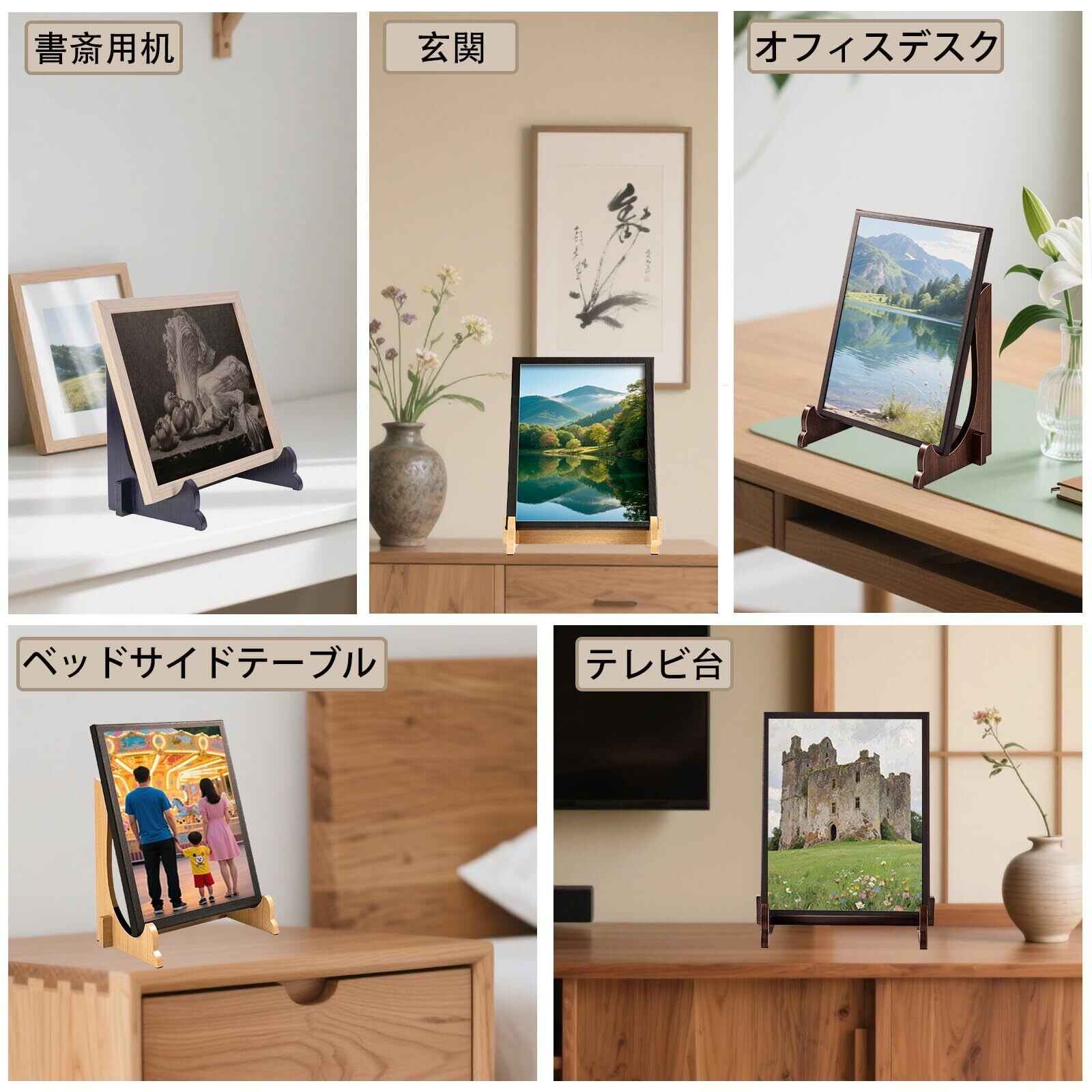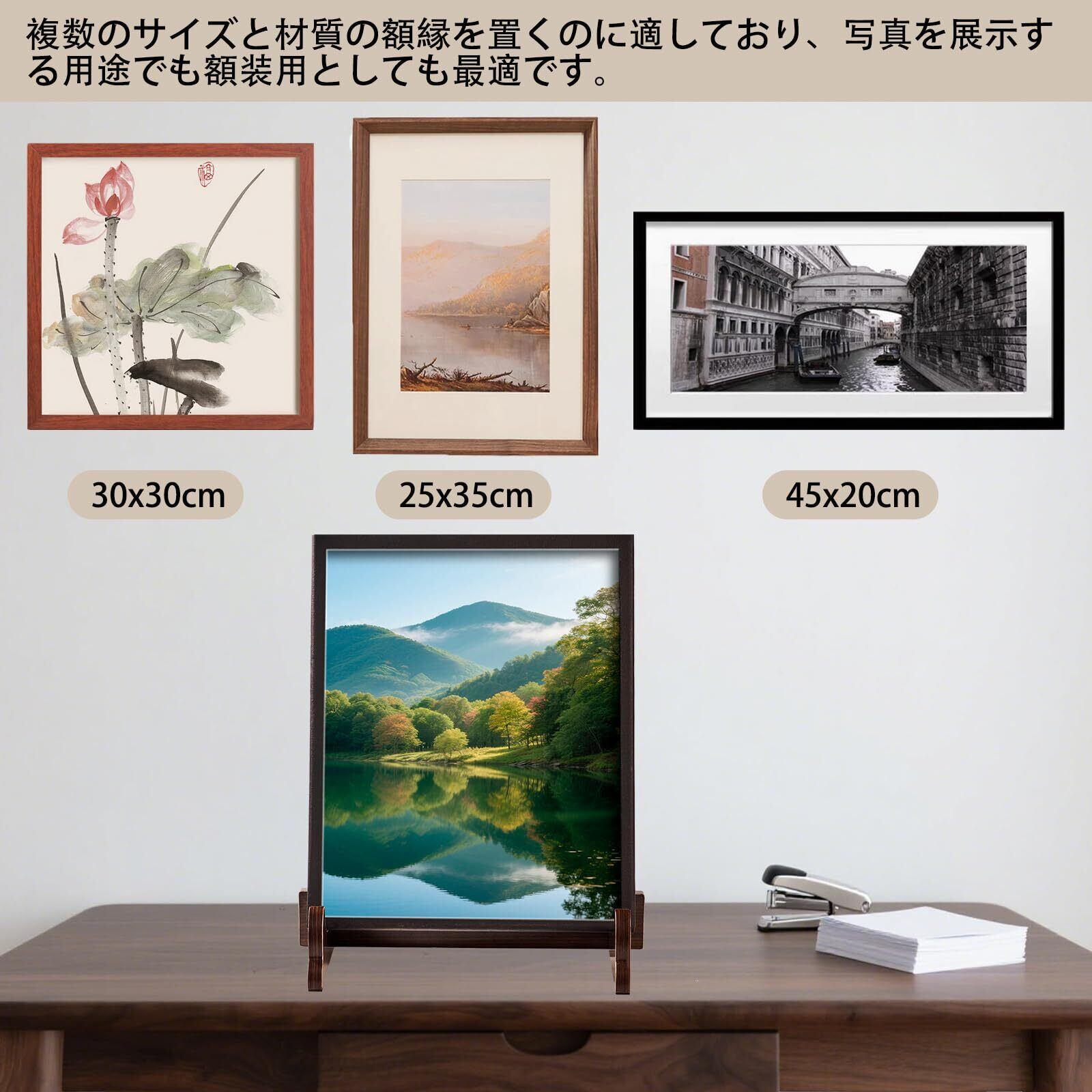 多彩なシーンで活躍する万能展示ソリューション :仏壇用の遺影たてとして、リビングのおしゃれな写真立てとして、オフィスの賞状たてとして、あるいはダイニングでお皿を美しく見せる木製皿立てとして。1台で様々な用途に使えるため、季節ごとに展示物を変えるのも簡単。遺影スタンドが必要な時も、普段はお気に入りの写真を飾る写真スタンドとしても活用できます。