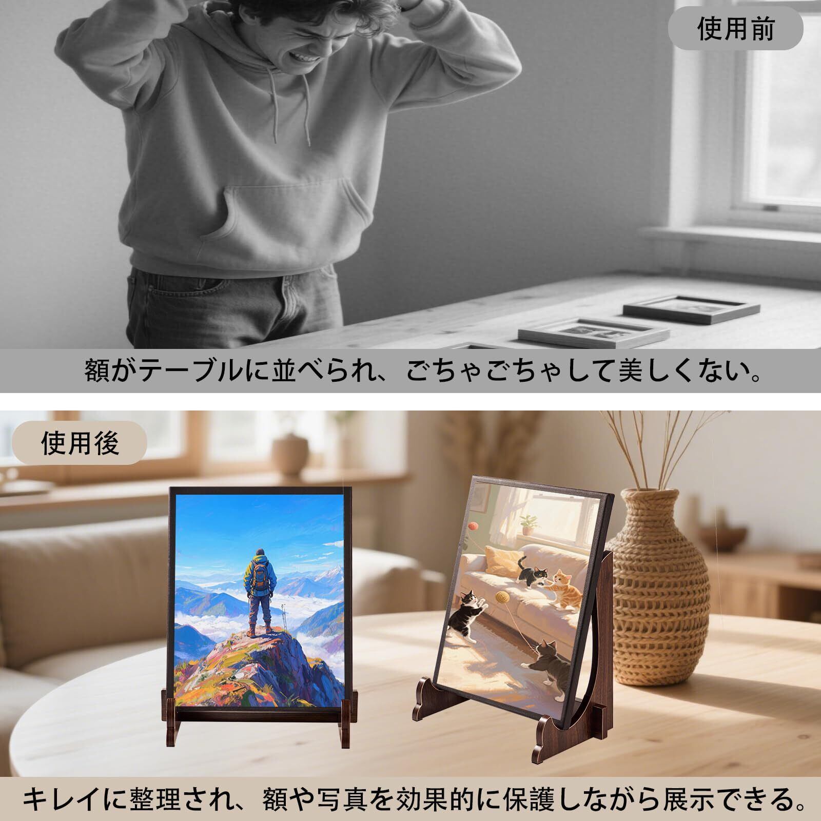 優れた素材とモダンなデザイン性を兼ね備えた逸品 :高品質な素材を使用した洗練されたデザインは、どんなインテリアにも馴染みます。頑丈な作りながらも軽量で、額縁スタンドとしても遺影たてとしても最適。本やアート作品、壁掛け時計、彫像、賞状など、様々なアイテムを美しく展示できます。工具不要の簡単組み立てで、すぐに使い始められます。簡単に組み立て可能で、分解して収納できるため、季節に合わせて展示内容を変更するのに便利です。