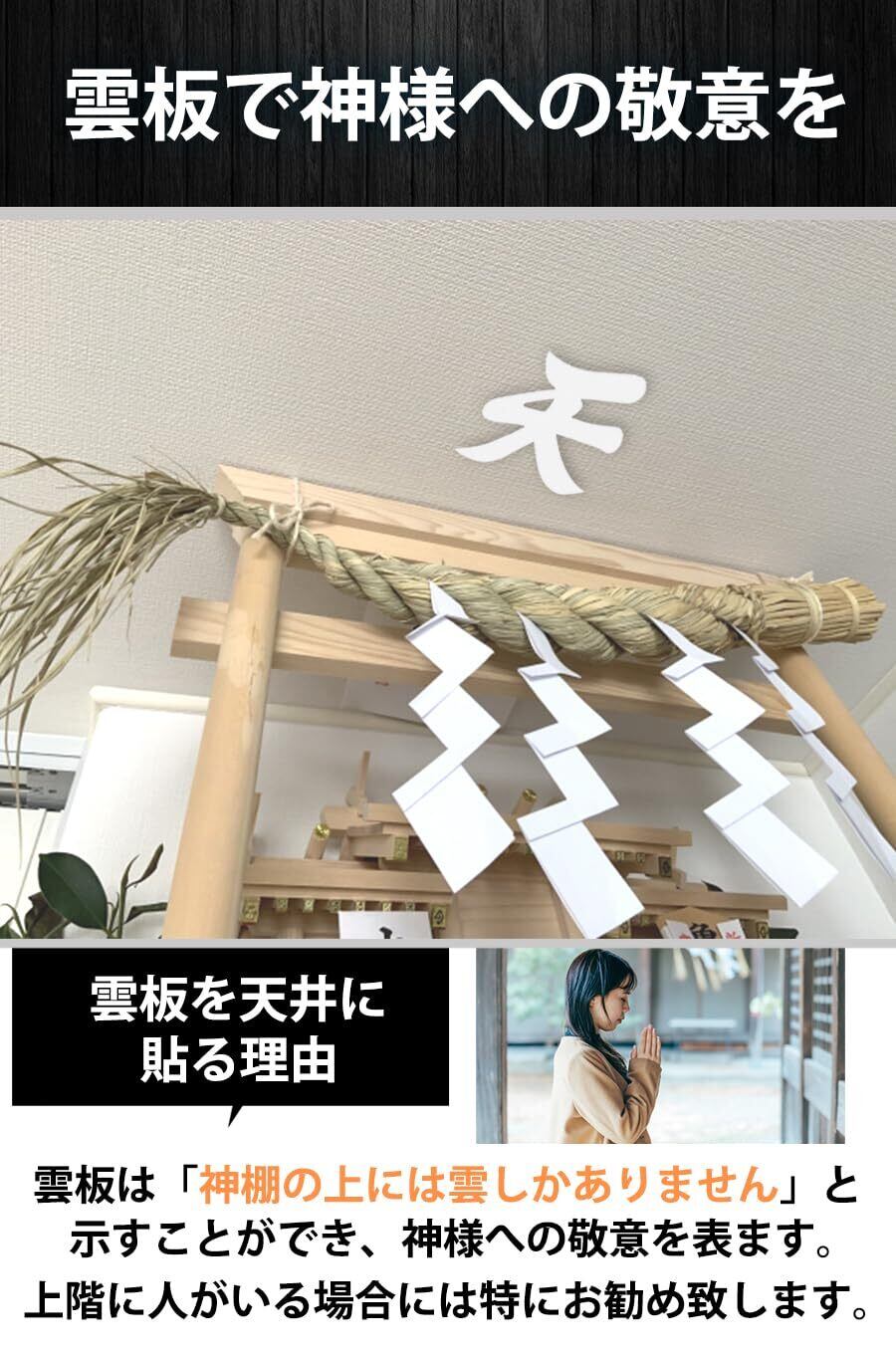 【使用方法】雲字は基本的には神棚の真上に貼ります。天井が低い場合や貼るのが難しい場合には、神棚の背後の壁に近い場所に貼ることも許されています。