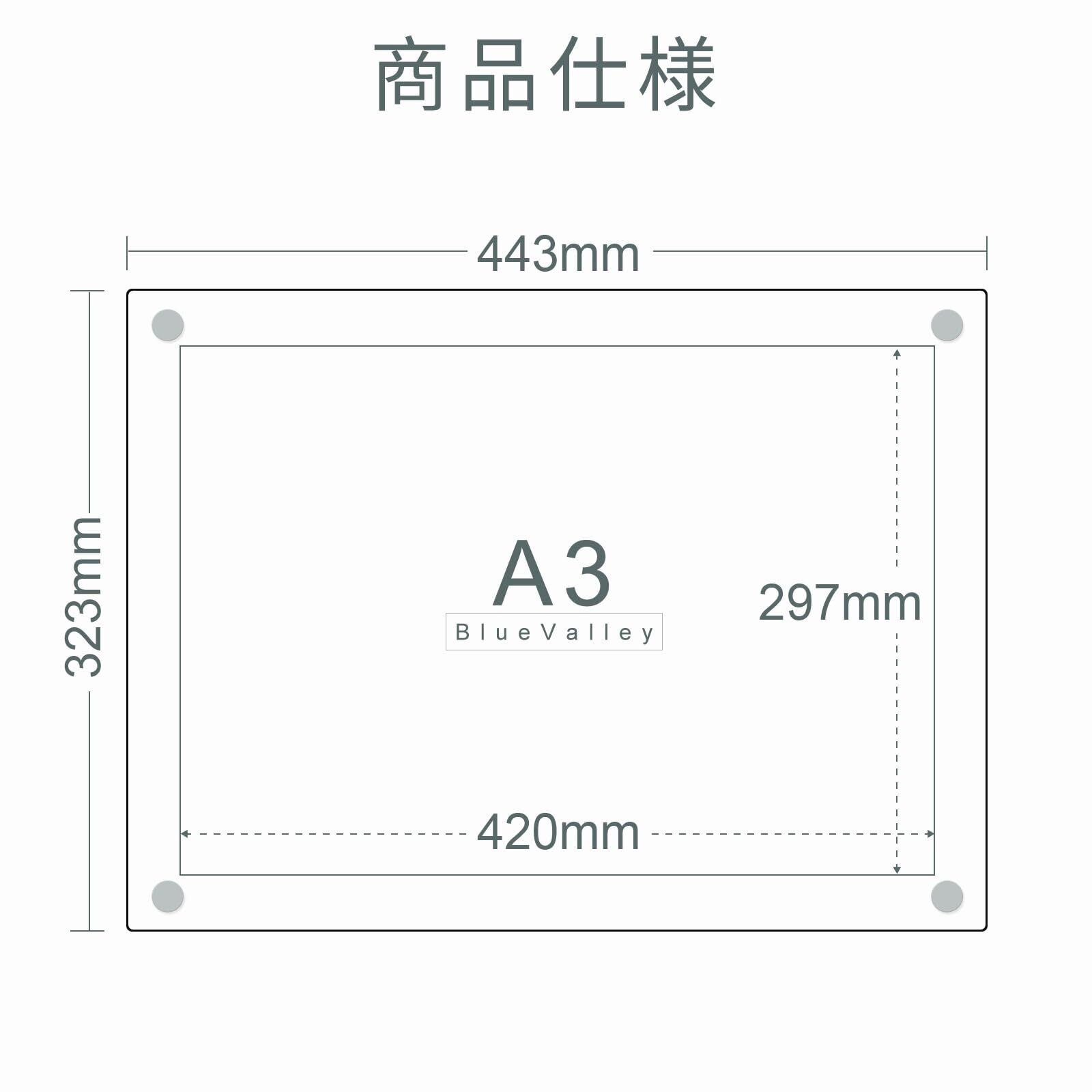 【適用サイズと特徴】アクリルフォトフレームの外部サイズは323x443mmで、A3判(297x420mm)の写真、賞状や証書用紙に対応しています。厚さ3mmのアクリルボードを使用しており、大切な写真、卒業証書、感謝状、証明書、サイン色紙などを安全に保護・ディスプレイできます。ご注意:購入前に、展示予定の用紙サイズをご確認いただき、商品画像に記載の寸法と合うかどうか必ずご確認ください。