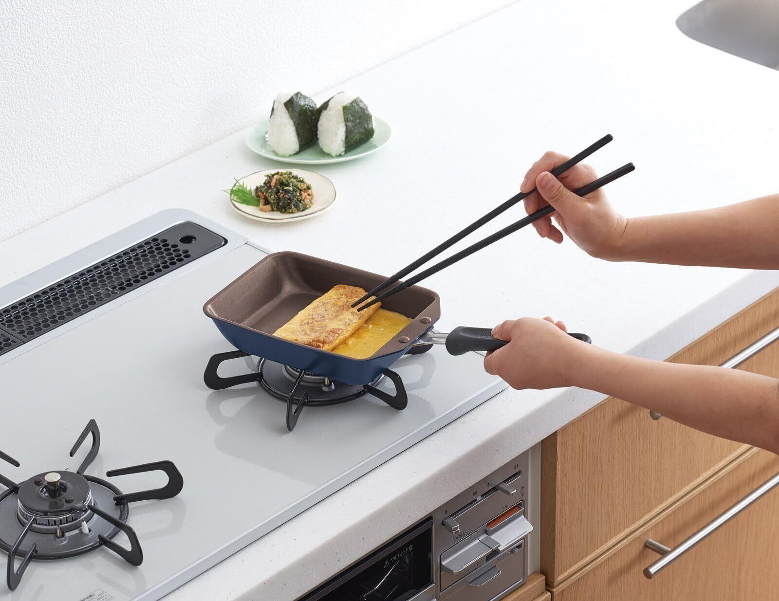 片手で軽々持てる軽量モデルのため、毎日の調理がとても快適です。フライパンのサイズと重さを考慮したデザインで、簡単に裏返したり、盛り付けることができるのが特長です。
